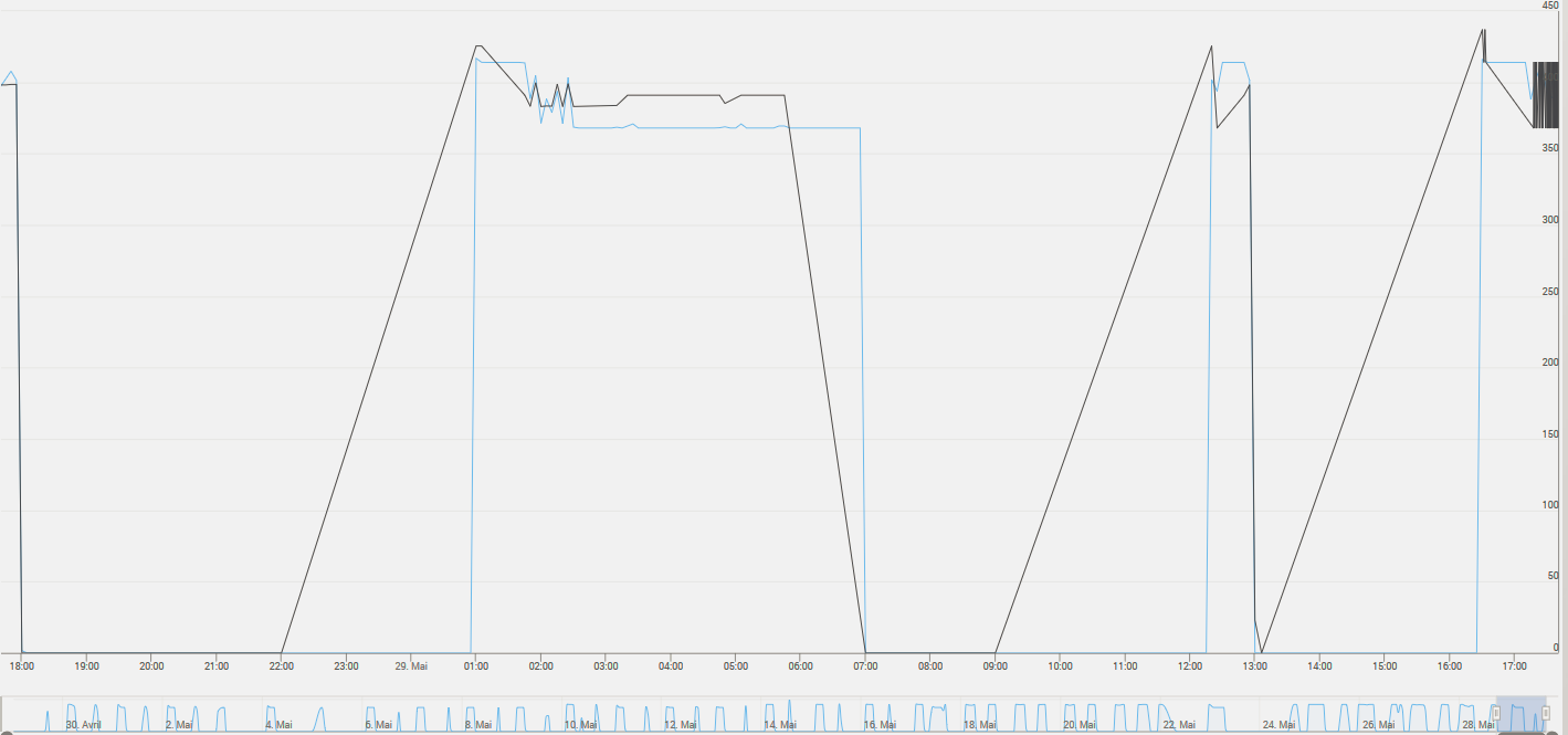 Je ne comprends pas pourquoi l’affichage de l’historique de mon virtuel est différent de mon sous-jacent en équipement. La courbe bleue est correcte. La courbe noire devrait stocker les 0 ramenés par ma sonde mais ne le fait pas ou pas tout le temps. J’ai évidemment mis à « répéter » les infos du virtuel, mais cela ne fait rien.