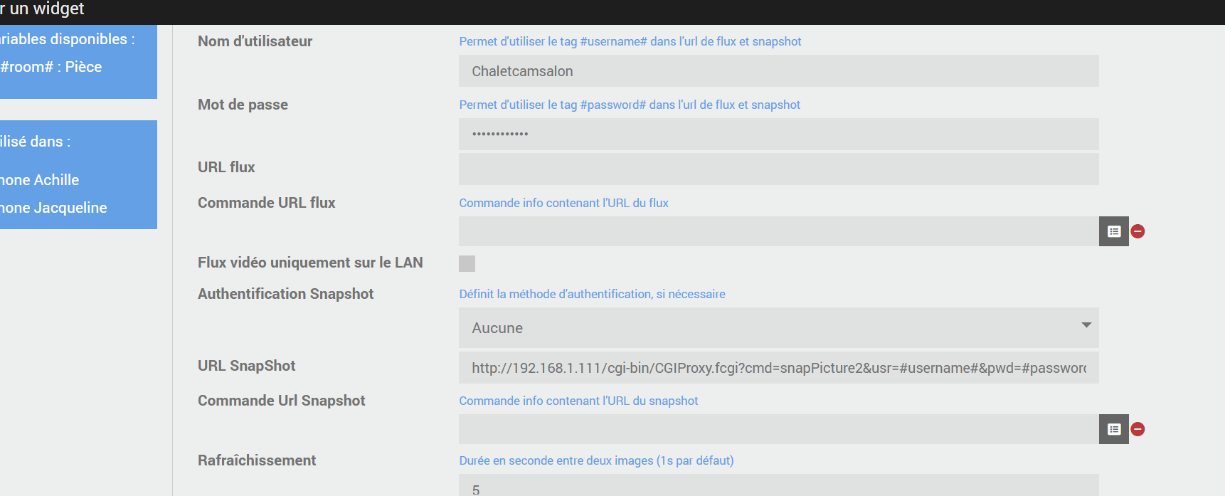 sur ma camèra Foscam PD5 au niveau de l’URL Snapshot (la seule commande remplie) j’ai ceci: http://adresse IP:port/cgi-bin/CGIProxy.fcgi?cmd=snapPicture2&usr=username&pwd=password