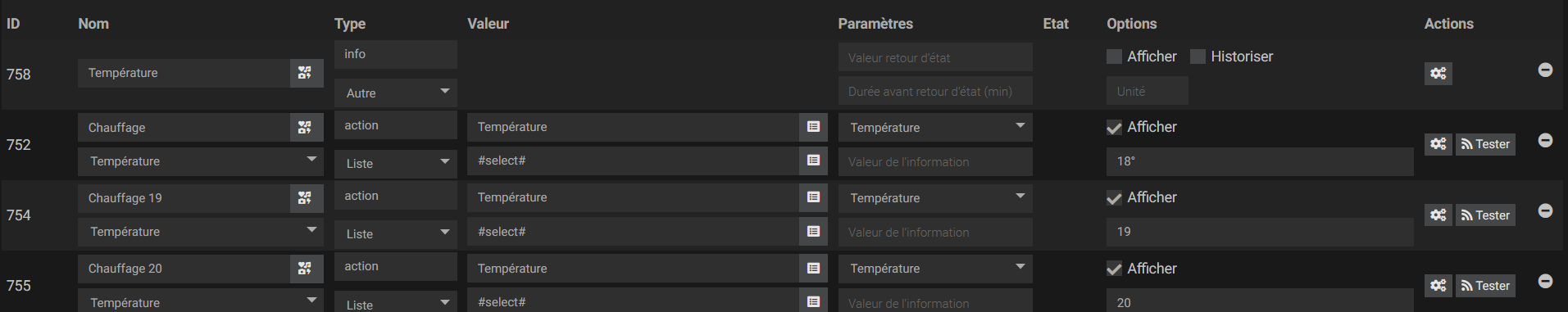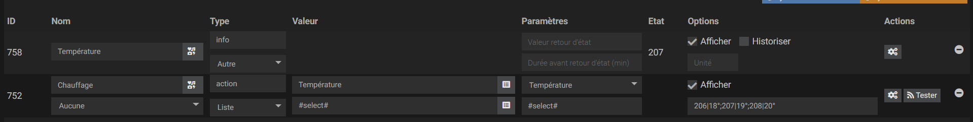 De plus j’ai essayé de chercher mon équipement après la commande #select# mais je ne peut pas choisir une consigne de température : ça ne me propose qu’une commande info…
