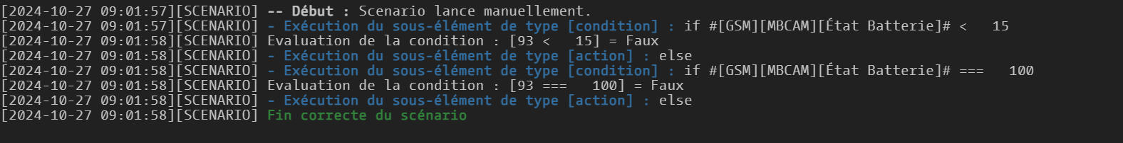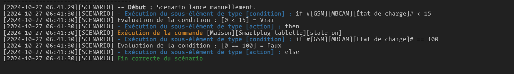 Je n’ai que cela dans le log scénario. Je ne comprends pas pourquoi l’exécution de la commande « state on » s’effectue alors que ma tablette est en charge avec batterie à 100% et la prise reste en ON (voyant toujours allumé).