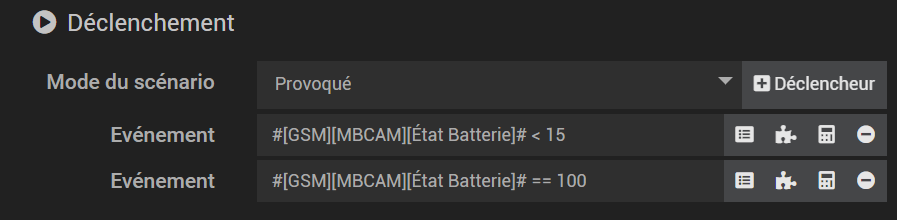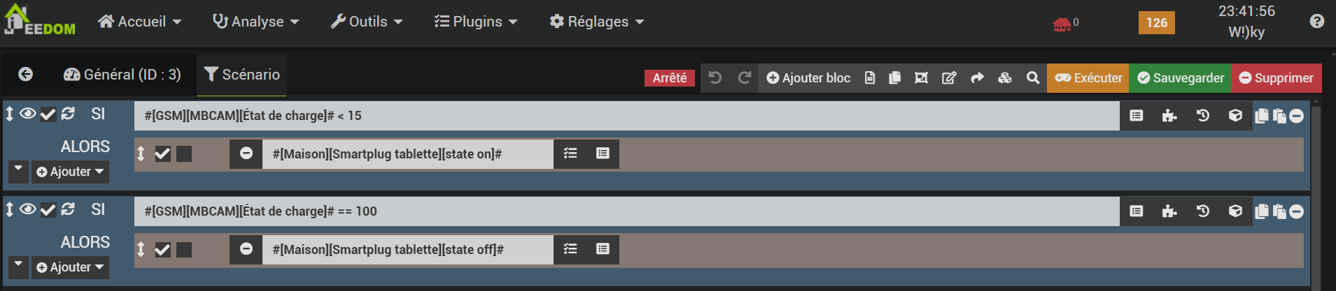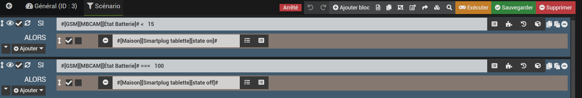 Je souhaite créer un scénario qui permettra d’allumer ma prise zigbee quand ma tablette est à 15% de charge et l’éteindre quand la charge atteint 100%.