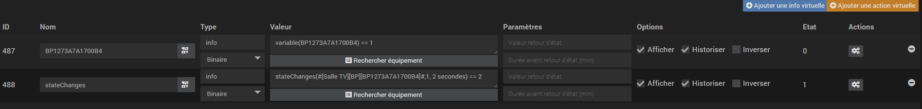 il faut cliquer sur « Rechercher équipement » pour aller chercher le nom de la commande BP… du virtuel. Là elle n’est pas correcte dans la fonction statesChanges
