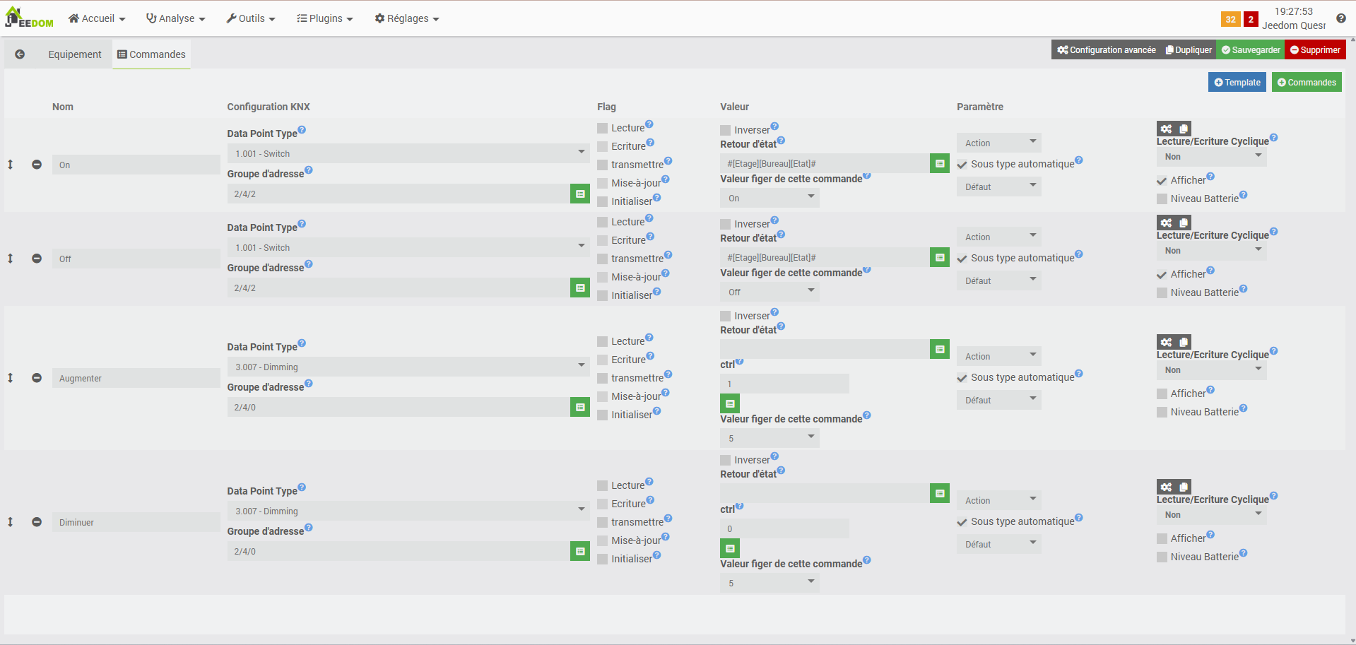 Pour contrôler des lumières, j’ai 4 actions : On, Off, Augmenter et Diminuer.