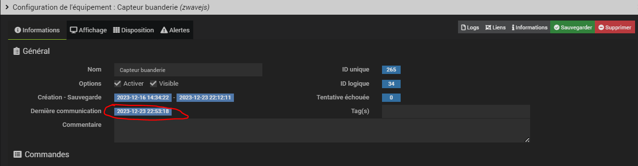Quand tu regardes dans la configuration de l’équipement, la date de dernière communication correspond à la dernière mise à jour d’une des commandes ? Si oui il faut récupérer ça