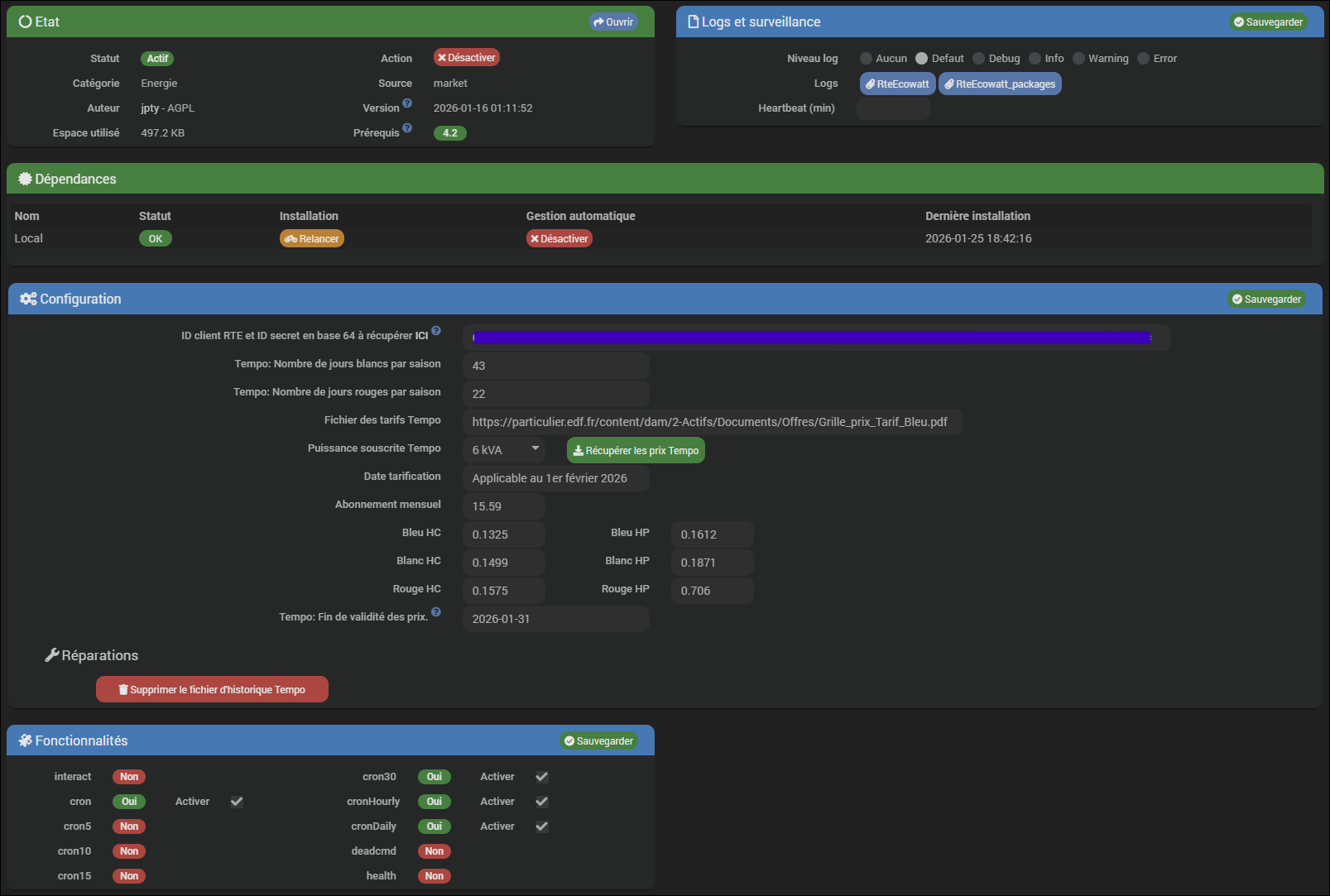 Je n’ai pas encore essayé de supprimer et de refaire l’équipement, mais je pense que ça ne sert à rien puisque c’est la configuration du plugin qui, d’une certaine manière, n’est pas prise en compte.