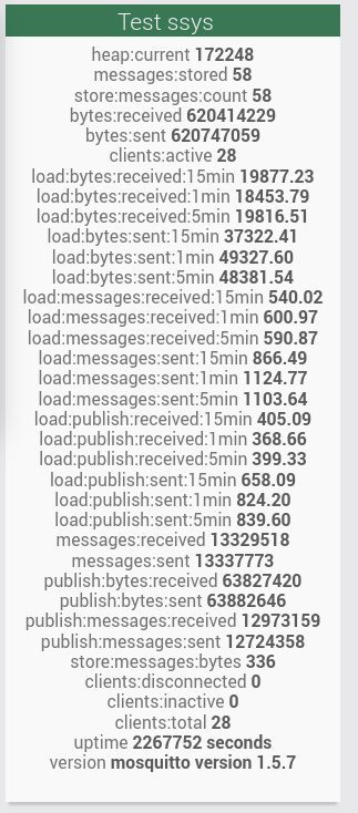 Par exemple le topic $SYS/brocker/version contient la valeur ‹ mosquitto version 1.5.7 ›.