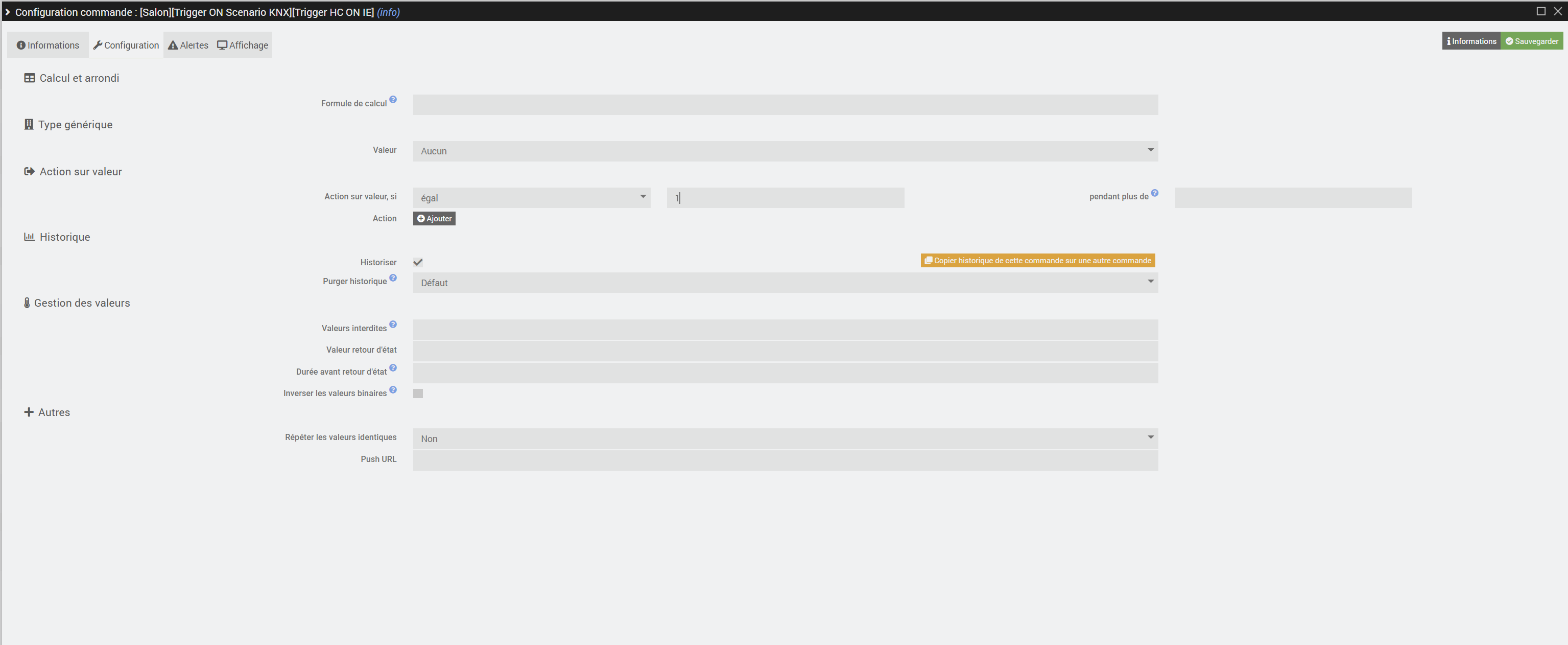 Tout est bien configuré sous ETS et Jeedom, mais là ou je galere, c’est sur le declenchement du scenario 1 (allumage HC) SI et SEULEMENT SI la valeur du retour d’etat est à 1, et declenchement du scenario 2 v(extinction HC) SI et SEULEMENT SI la valeur est à 0.