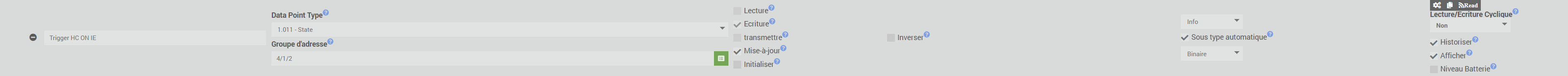 Dans mon cas, le retour d’etat lu par EIB se mettra à zero lors de l’appui sur un deuxieme bouton physique (configuré en commutation forcée sur off (valeur 0) sur la meme adresse de groupe). La valeur 0 declenchera sous Jeedom un autre scenario « HC OFF ».