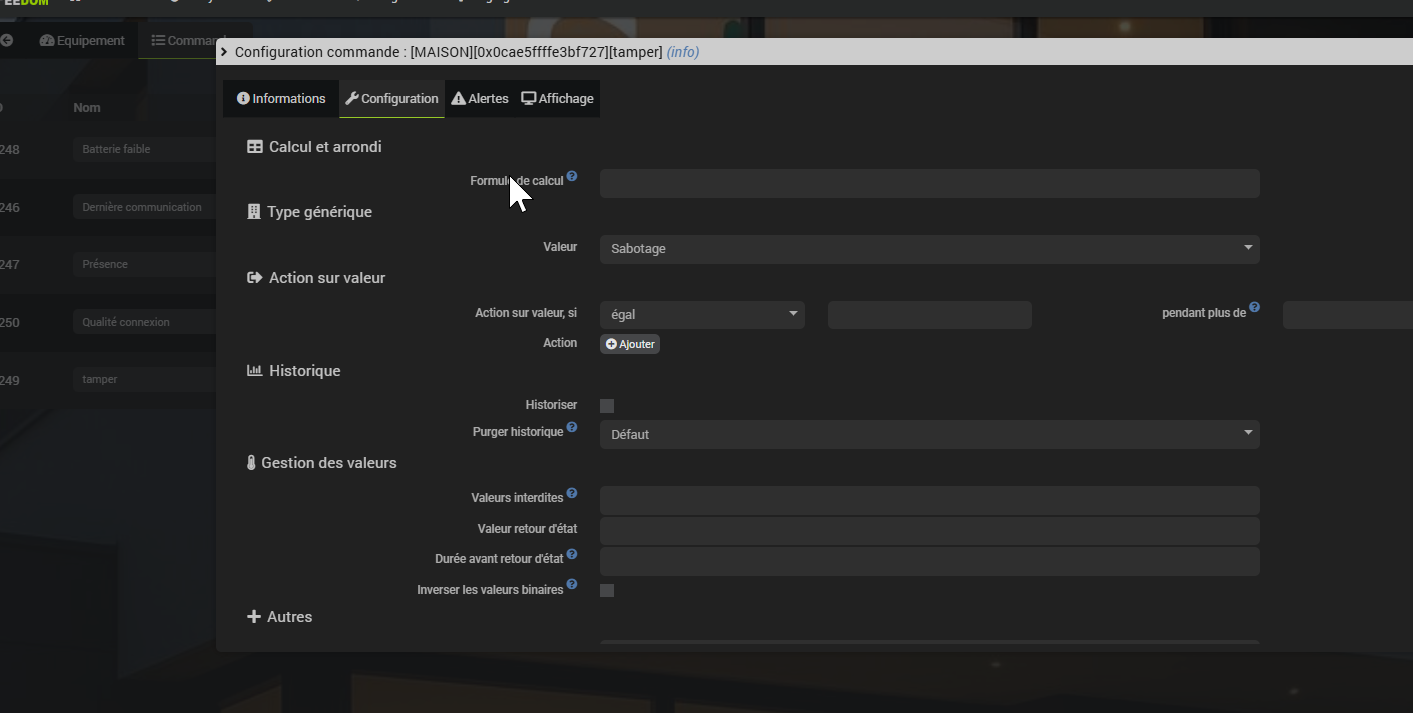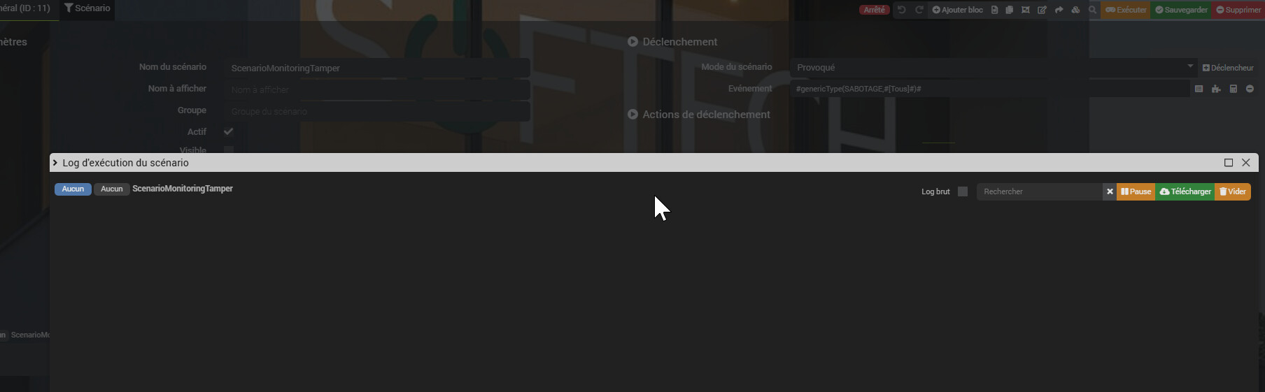 je voulais réaliser un scenario qui déclenche une alerte dès que j’ai un détecteur qui est saboté, les détecteurs remontent bien l’info de sabotage sur l’équipement, j’ai bien déclaré le type en sabotage sur la commande info mais mon scenario n’est jamais déclenché avec l’évènement : "#genericType(SABOTAGE,#[Tous]#)# "