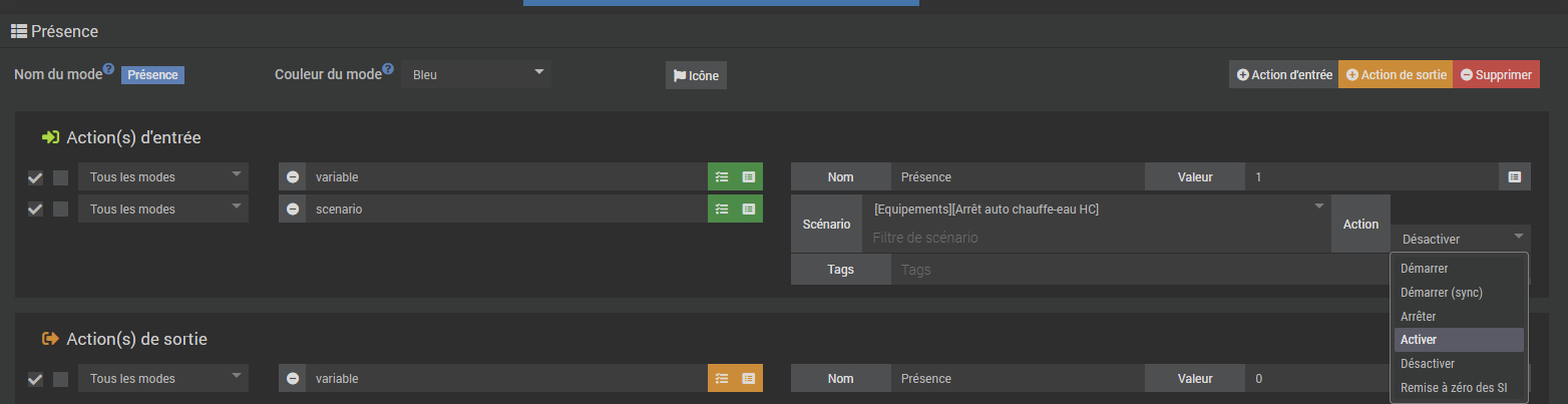 → la configuration du mode ‹ absent › créé, avec ses actions d’entrée, de sortie,…