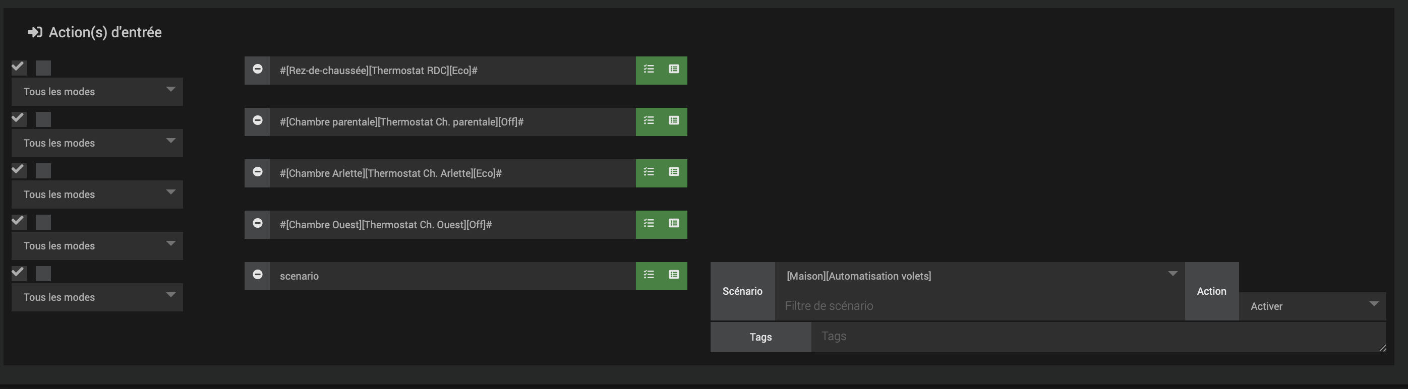 J’ai créer plusieurs modes dans le plugin dédié à cela et je souhaite que l’ensemble des volets électrique se ferment et s’ouvrent en fonction des éphémérides lorsque la maison est en mode « absent ».