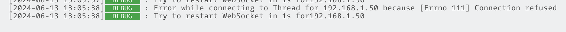 [2024-06-13 12:48:51] DEBUG : Error while connecting to Thread for 192.168.1.50 because [Errno 111] Connection refused