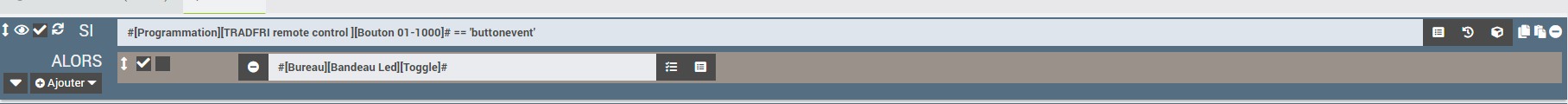 on teste que le bouton 1 est bien celui qui a déclenché le scénario : SI #[Programmation][TRADFRI remote control ][Bouton 01-1000]# <= 1010 ALORS …