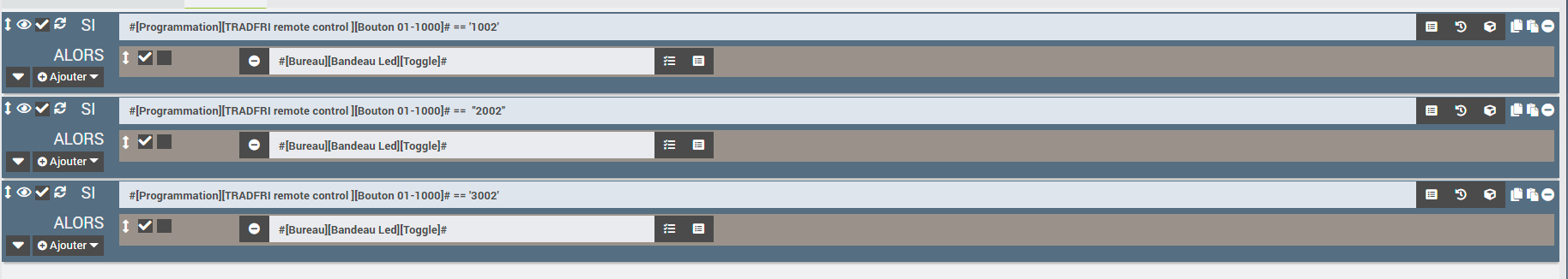 puis sur le code retourné : SI #[Programmation][TRADFRI remote control ][Bouton 01-1000]# == 1002 ALORS …