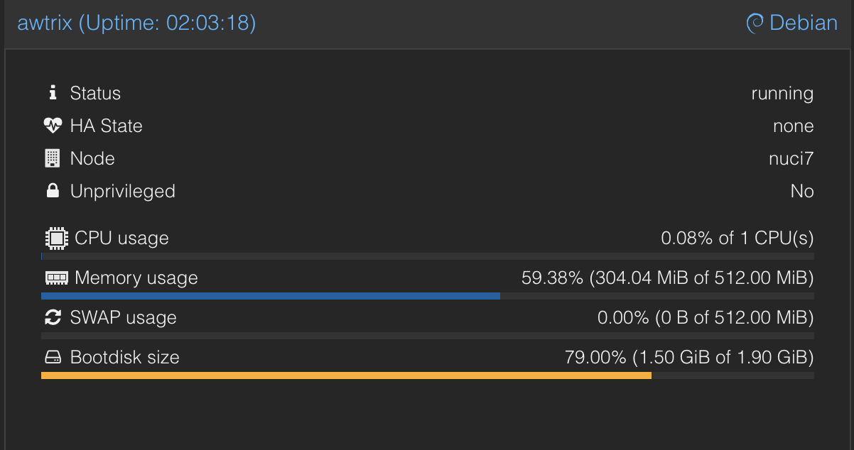 J’ai donc installé le serveur Awtrix sur une machine Debian 13 (LXC sous Proxmox):