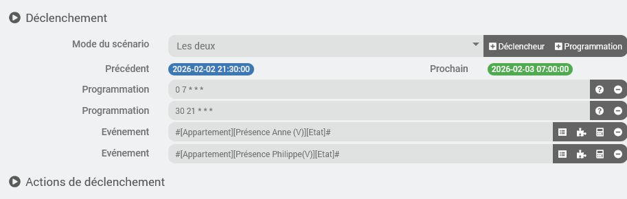Mais il te manque en déclencheur tes 2 commandes de présence Philippe et Anne afin que le scénario se déclenche quand il y a un changement de l’état de présence de l’un de vous deux.