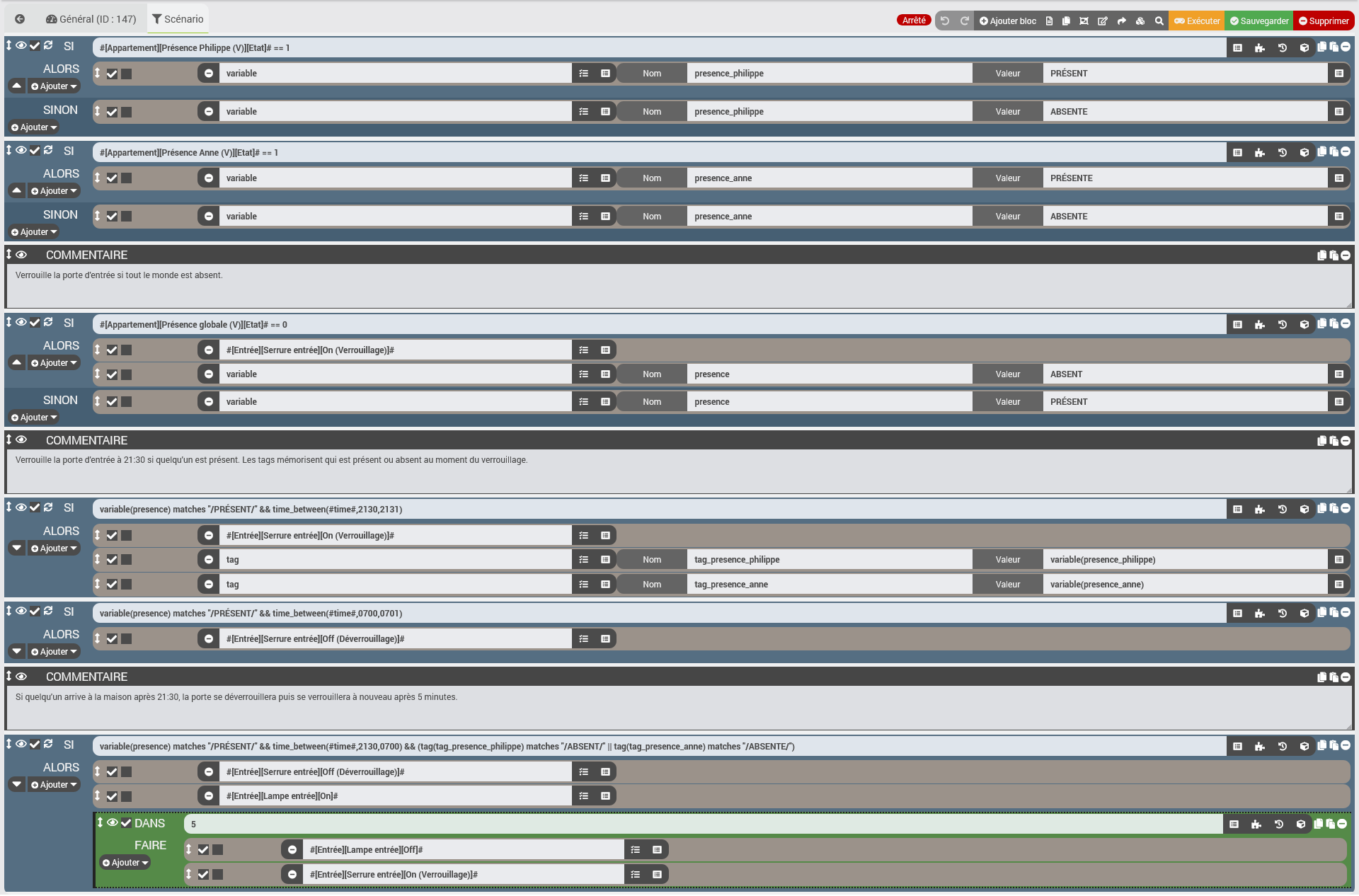 C’est ce que j’avais fait dans mon premier scenario (je crois parce que je l’ai effacé) mais dans ce cas « presence_globale » peut prendre la valeur 1 ou 2. On ne sait donc pas si quelqu’un doit rentrer après 21:30. Je me trompe ?