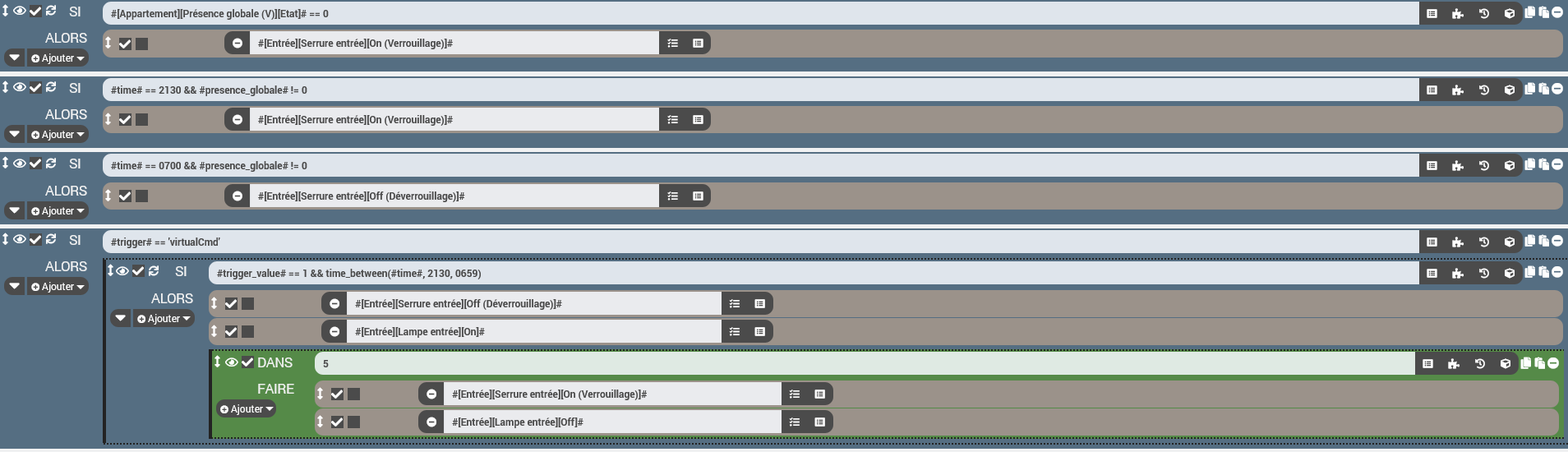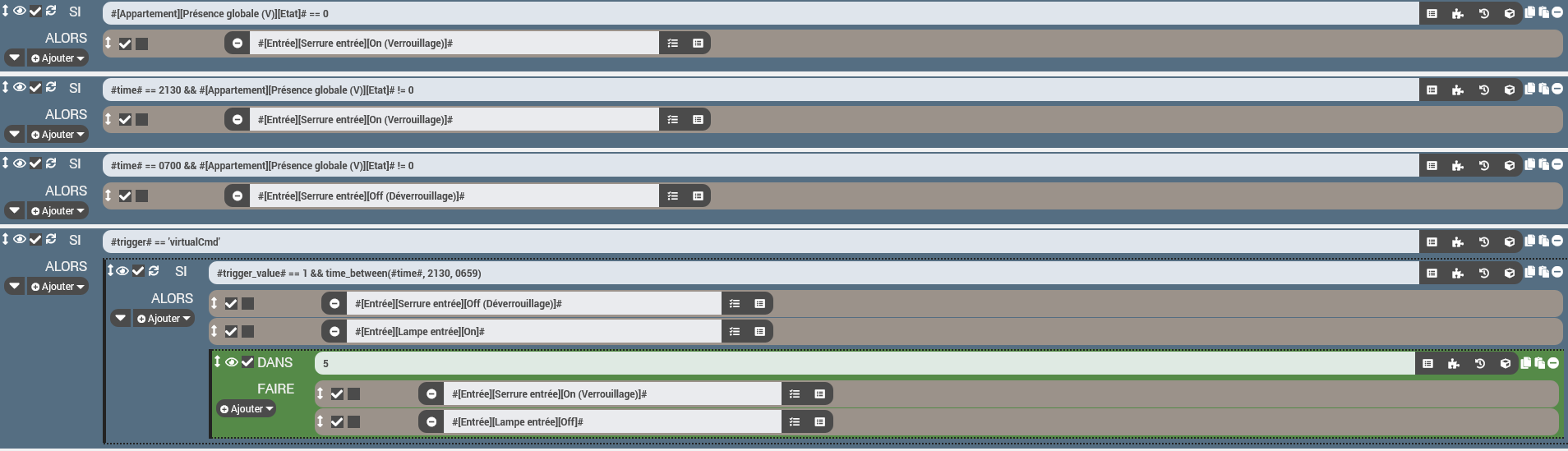 Actuellement le dernier bloc SI vérifie que quelqu’un rentre entre 21h30 et 0659, Anne ou toi pour déclencher l’ouverture et referme 5mn plus tard.