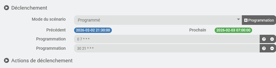 [2026-02-02 22:30:08][SCENARIO] -- Début : . Tags : {"#trigger#":"schedule","#trigger_name#":"","#trigger_id#":"","#trigger_message#":"Scénario exécuté automatiquement sur programmation","#trigger_value#":null}