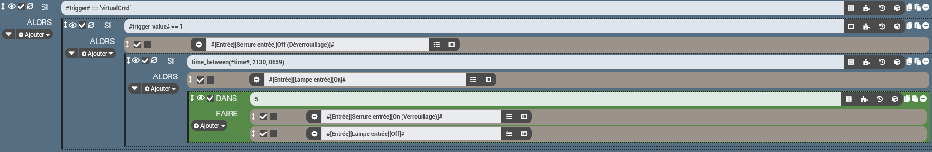 Par contre rien n’empêche de rajouter ton allumage de lampe entre 21h30 et 07h00, mais le bloc Dans doit être au même niveau que l’action de Déverrouillage.