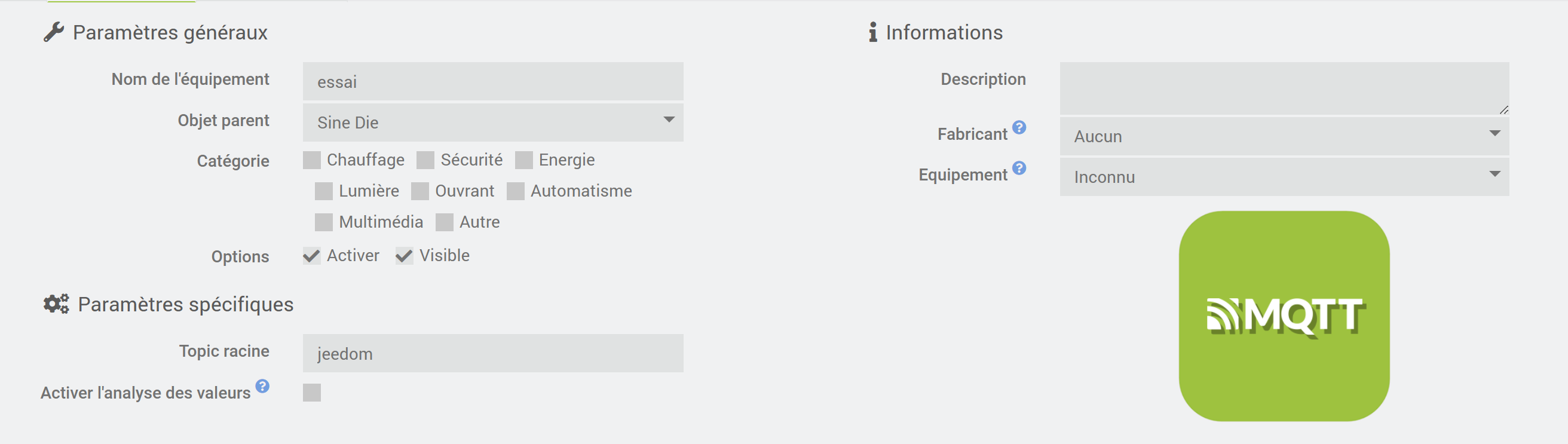Sur mon Jeedom (sur le plugin Mqttmanager) je crée un équipement « essai »