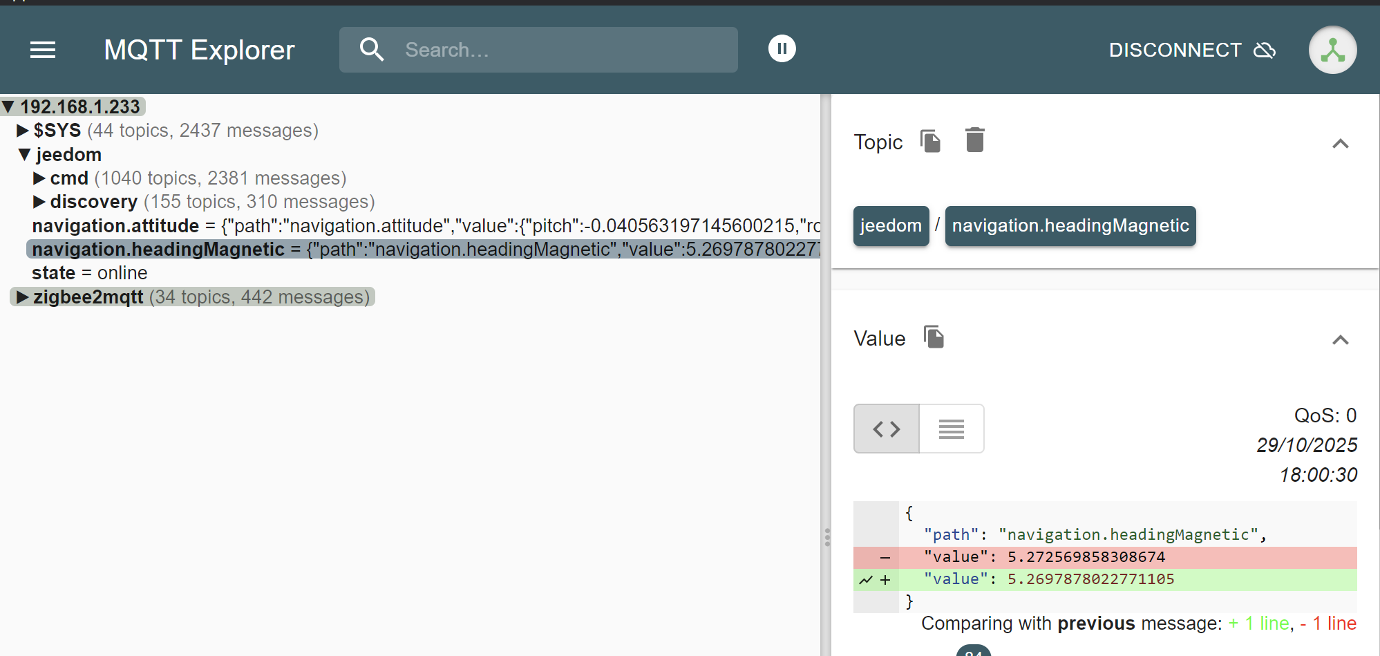 J’ai un RPI4 sur mon bateau qui fait un certain nombre de mesures. Tout cela va dans un protocole (une appli) qui s’appelle signalk. Je voudrais remonter quelques unes de ce mesures dans mon Jeedom en m’appuyant sur Mqtt. Sur SignalK il y a un plugin « MQTT Sensors » qui permet d’envoyer des données choisies sur un brooker. Actuellement je suis en réseau local. Sur Jeedom (sur un autre Rpi4) j’ai toutes mes équiepements qui marchent (bien) avec Jzigbee. J’ai récupéré adresse, port, login et password du brooker mosquito et j’ai parametré cela dans SignalK. Je choisi « jeedom » comme topic racine et J’envoie par exemple la donnée navigation.headingMagnetic sur le path navigation.attitude.