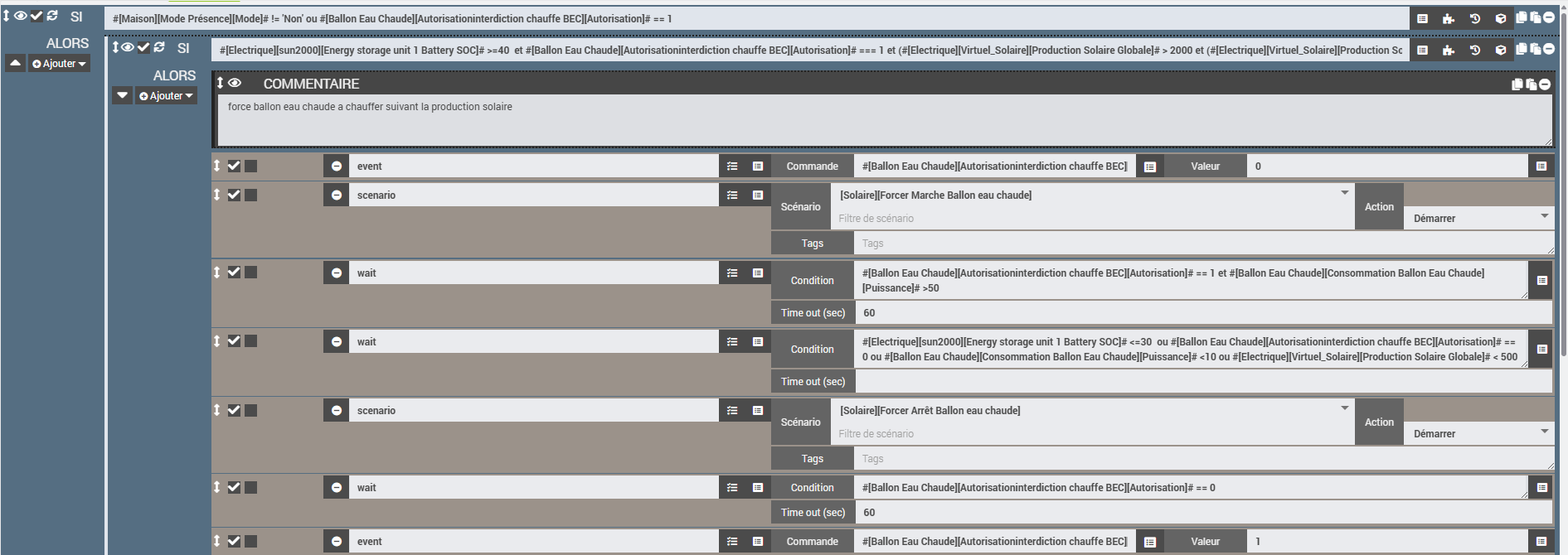 1- la production solaire < a ma consommation actuel + conso de mon ballon et si si ma batterie passe en dessous de xx %