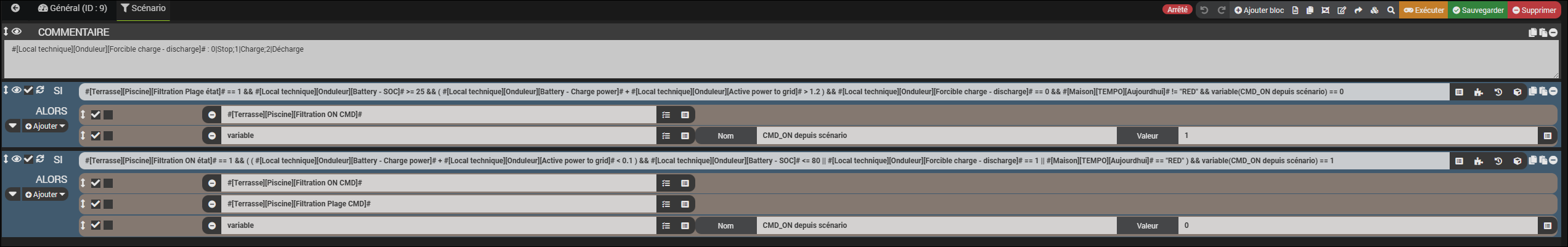 Oui, j’ai défini une règle empiriquement : si la somme de la puissance de charge des batteries + la puissance vers le réseau (c’est donc la somme de tout ce qui est produit et pas directement utilisé) est supérieure à 1.2 kW et que les batteries sont chargées à 80% et plus alors je démarre la pompe de la piscine « manuellement ». Normalement, la pompe a un mode de fonctionnement basé sur des plages horaires donc elle tourne assez dans la journée juste avec ce mode-là mais comme ça je profite de faire circuler un peu plus afin de profiter du chauffage solaire.