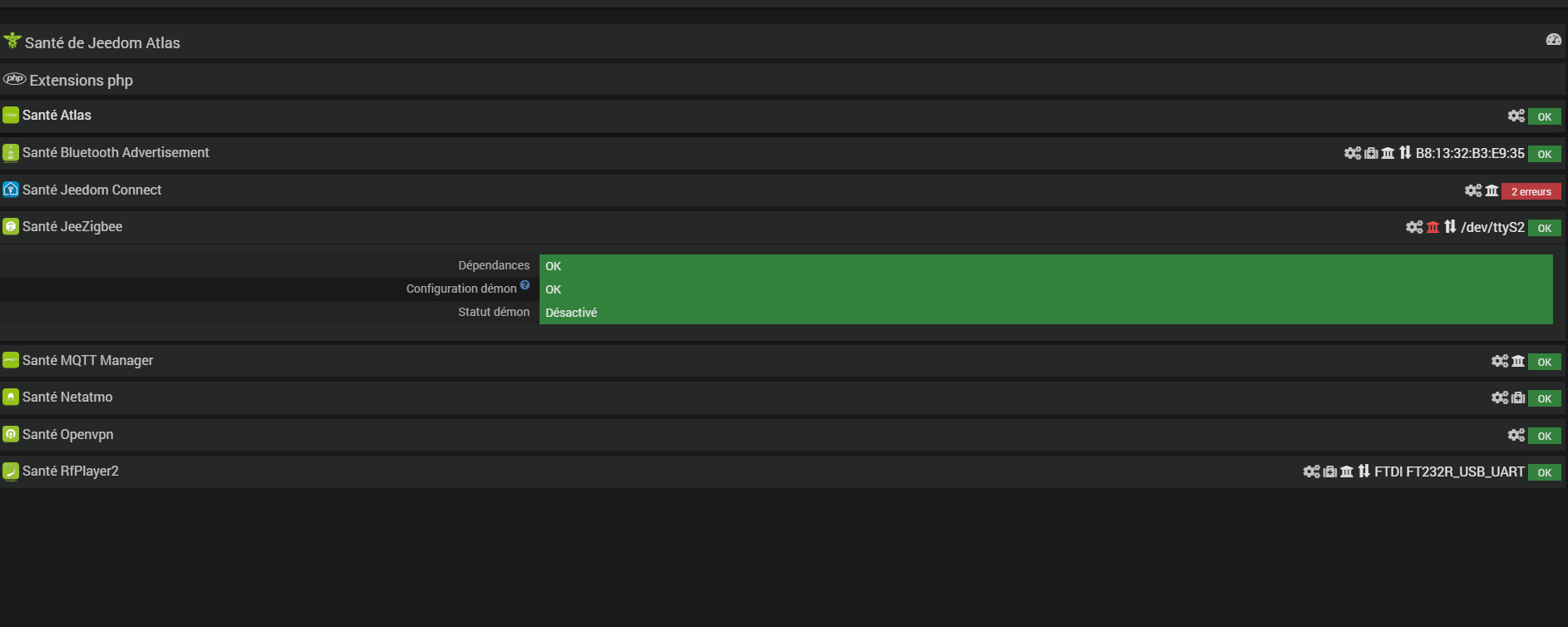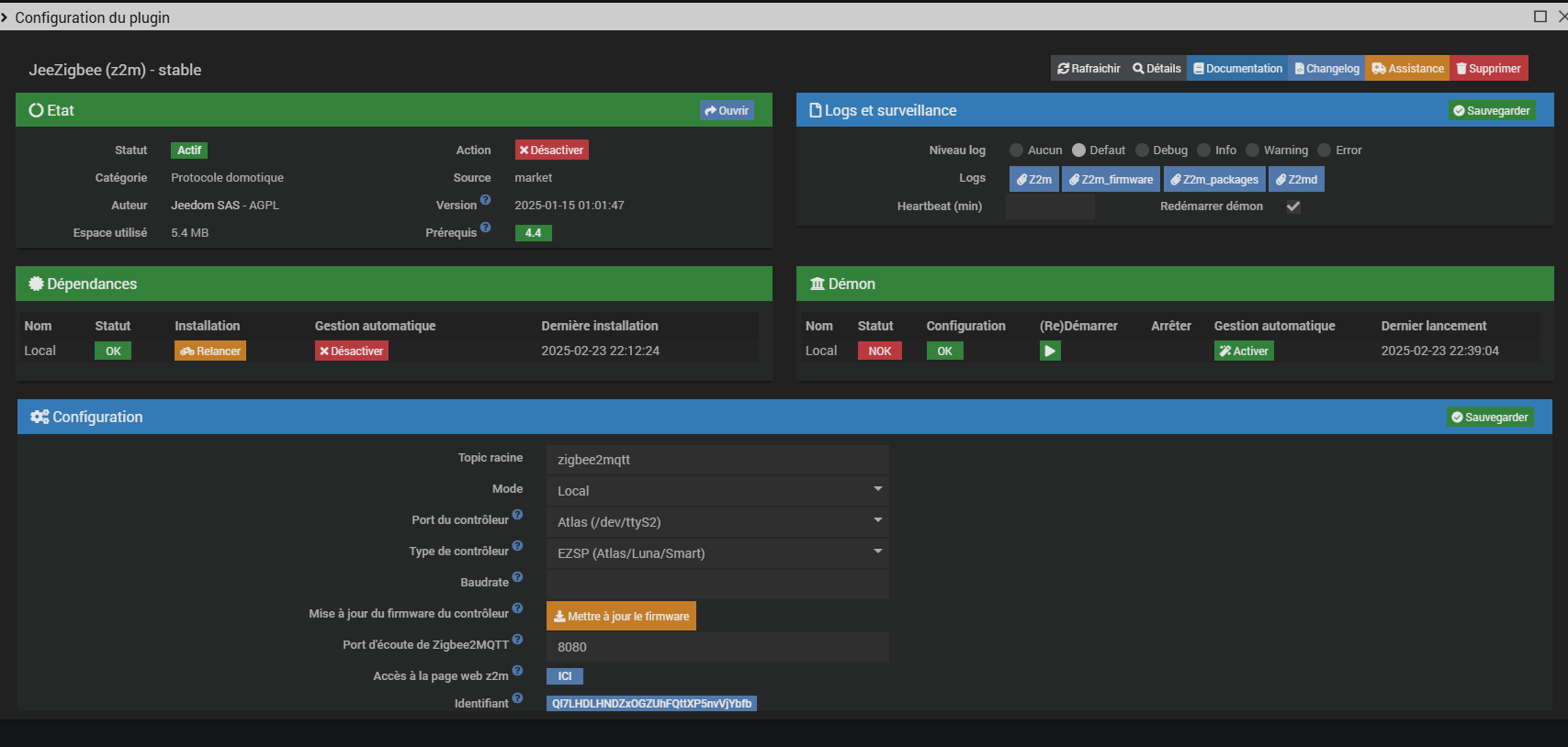 Je souhaite installer des récepteur ORVIBO avec le plugin JeeZigbee mais dès que passe en inclusion le démon revient sur NOK. Sur la page santé il est indiqué que le Démon est en module Manuel. Mais dans la config il en auto.