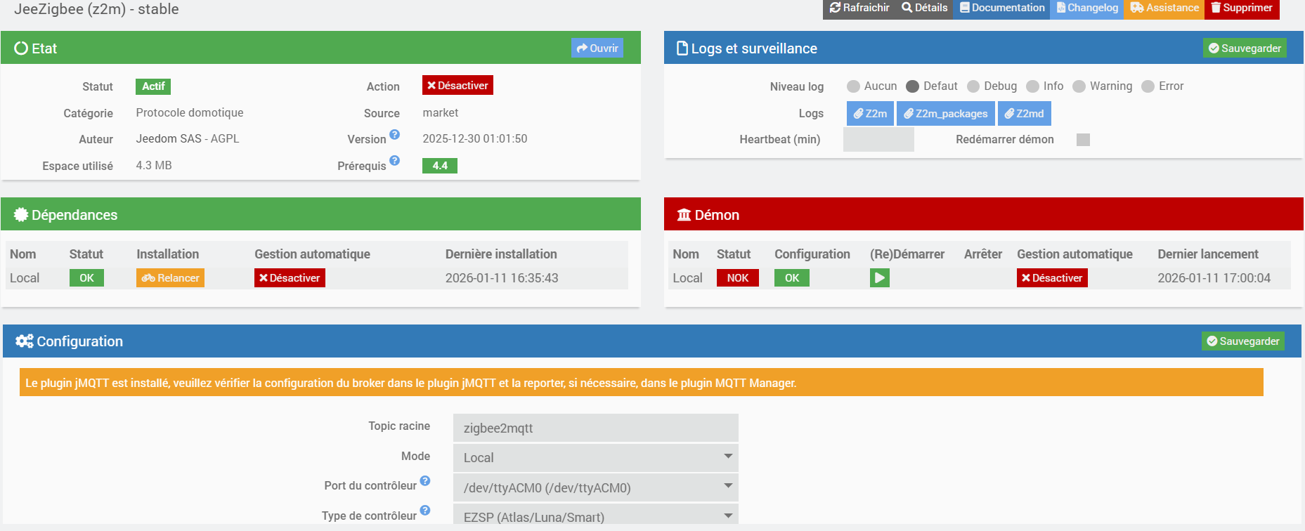 J’utilise le plugin JEEZIGBEE mais le démon ne se lance plus (si je le redémarre, il apsse au vert quelques secondes puis en rouge).