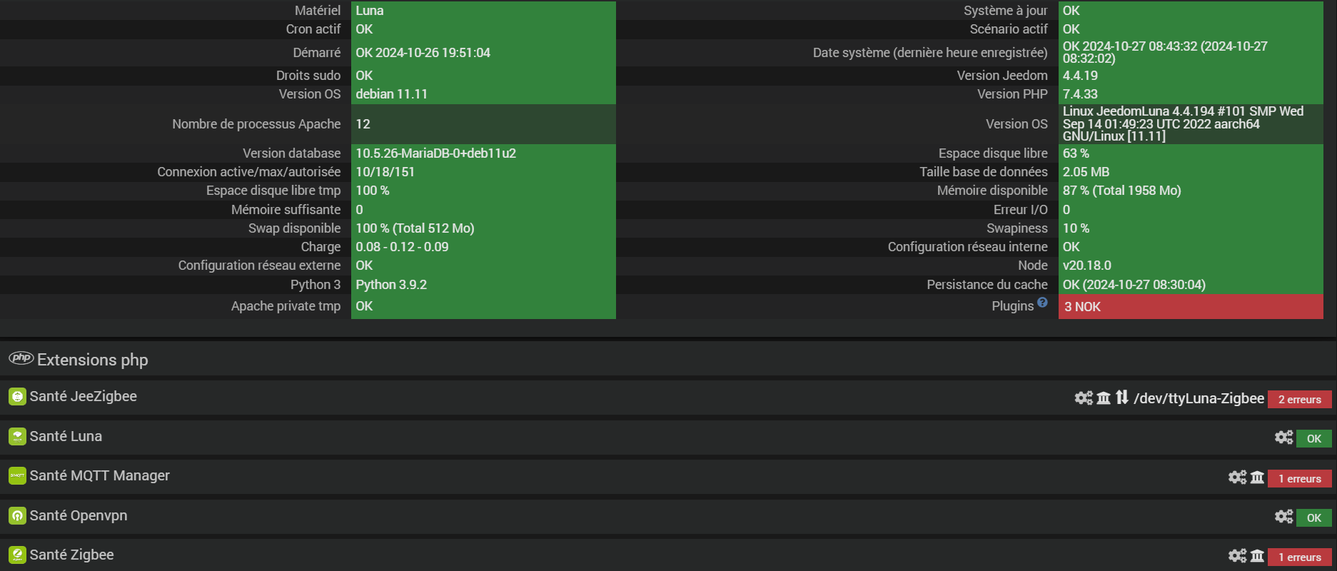Nombre de processus Apache 13 Version OS Linux JeedomLuna 4.4.194 #101 SMP Wed Sep 14 01:49:23 UTC 2022 aarch64 GNU/Linux [11.11]
