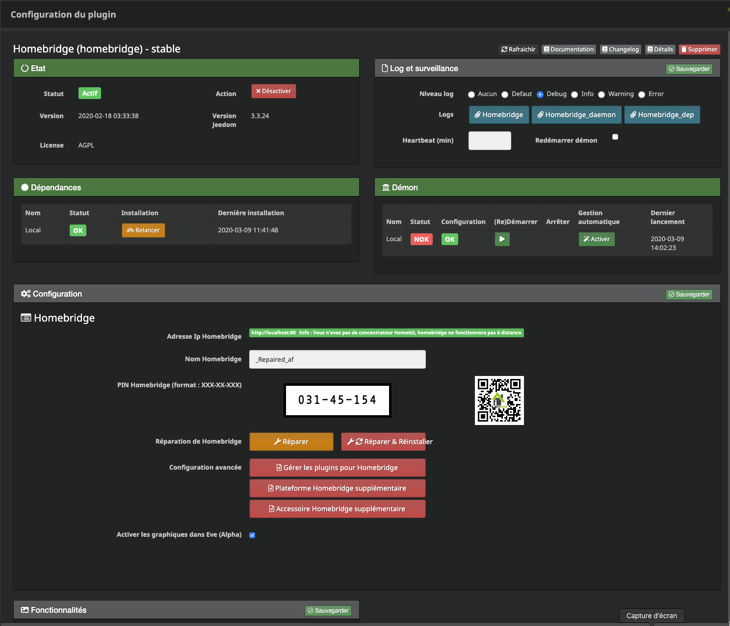 Voila les logs de dépendances, par contre un « réparer et réinstaller » vas me faire perdre ma config « homekit »?