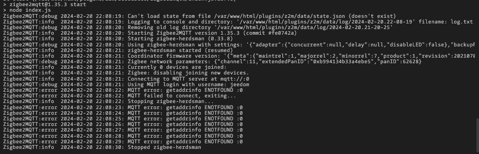 Zigbee2MQTT:info 2024-02-20 23:11:26: Connecting to MQTT server at mqtt://127.0.0.1:1883