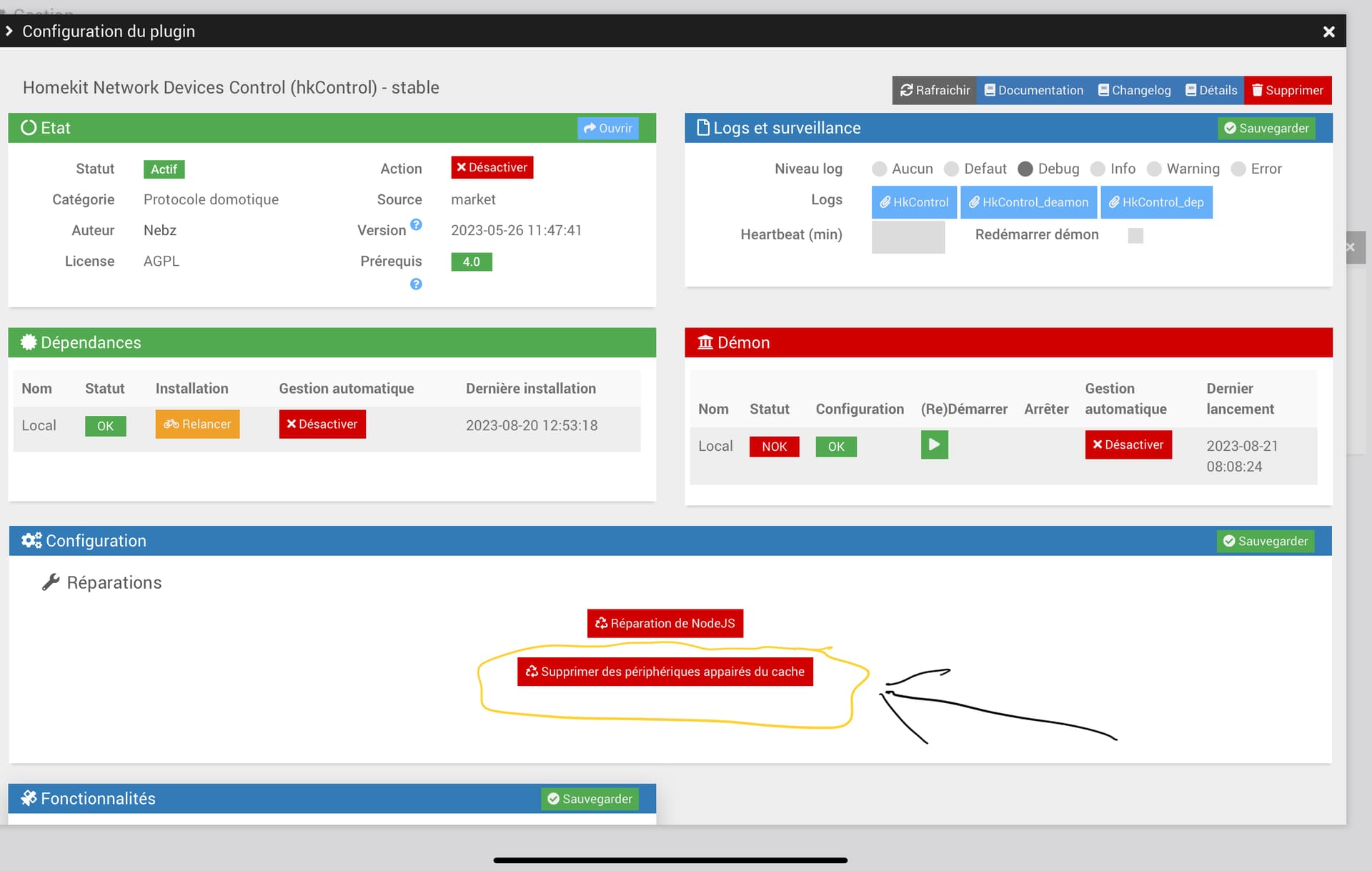 Bon par contre quand je vais dans le panneau de config du Plugin et que je fait. Supprimer des périphériques appairés du cache