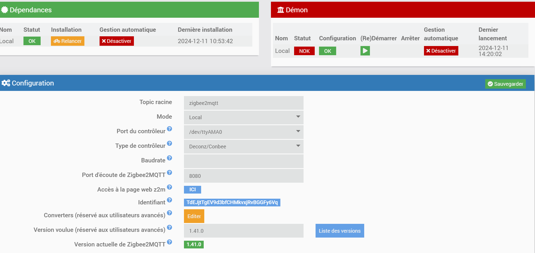 Bonjour, depuis la mise à jour du plugin le demon reste en NOK. J’étais sur un rpi3b+ en debian 10 et je suis passé sur un rpi4 en debian 11 mais impossible de mettre le demon en ON.