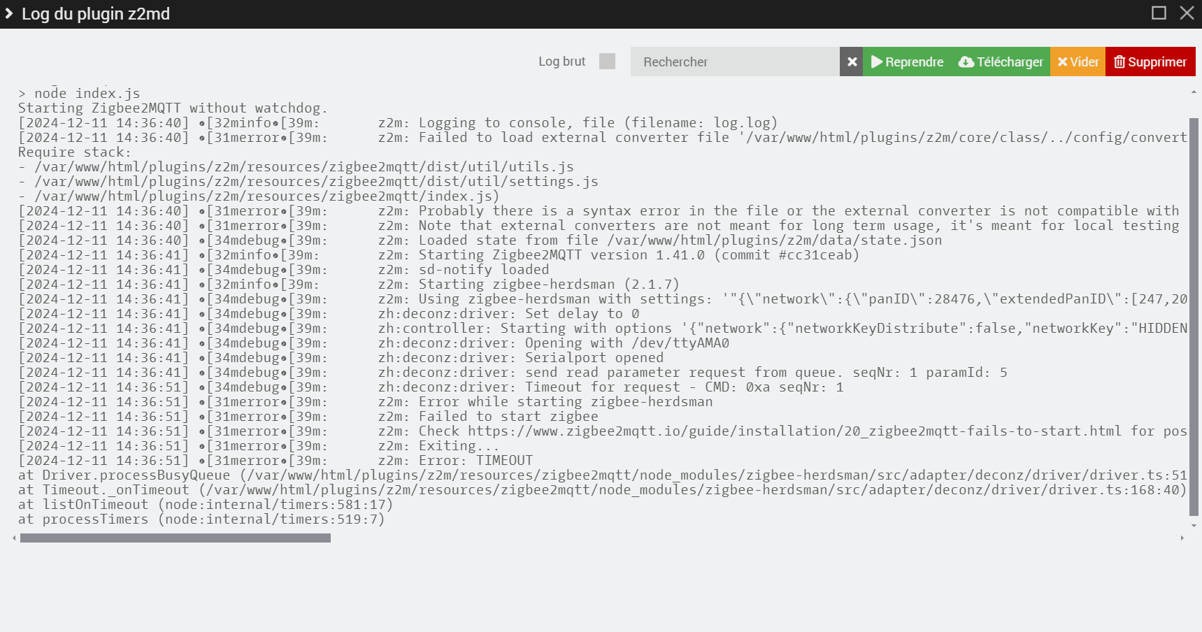 at Timeout._onTimeout (/var/www/html/plugins/z2m/resources/zigbee2mqtt/node_modules/zigbee-herdsman/src/adapter/deconz/driver/driver.ts:168:40)