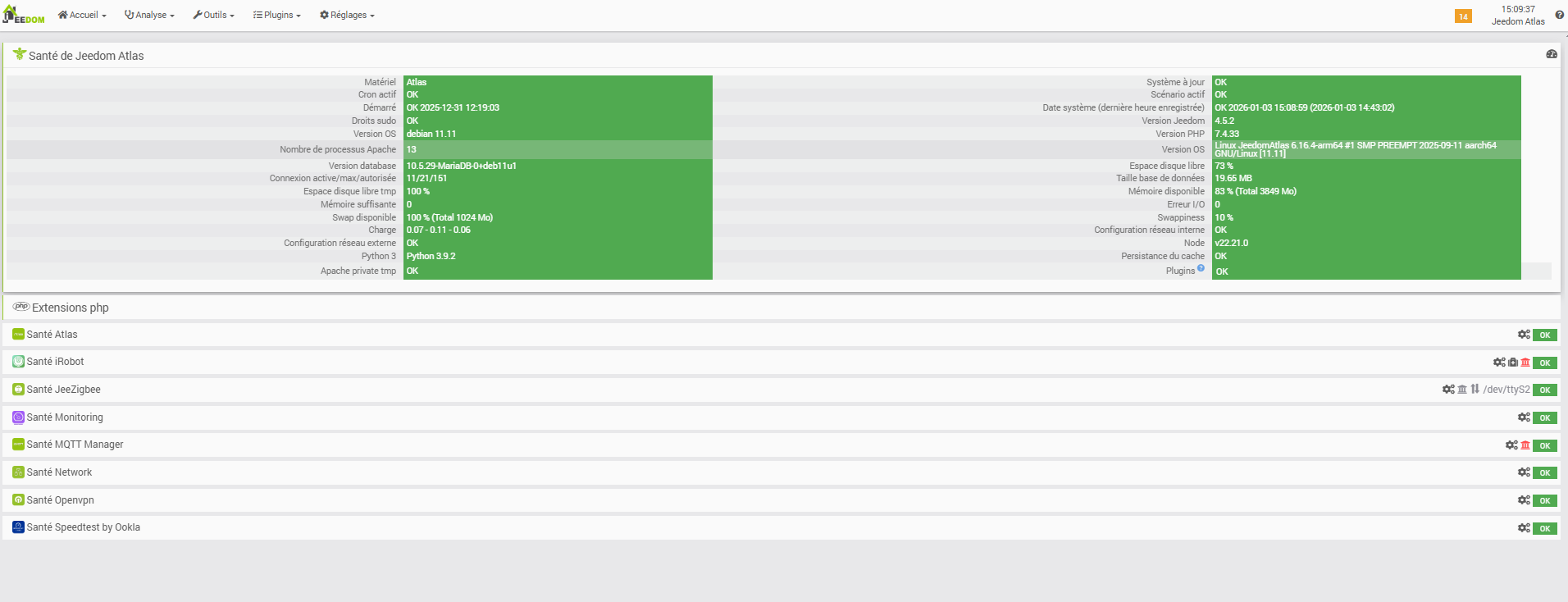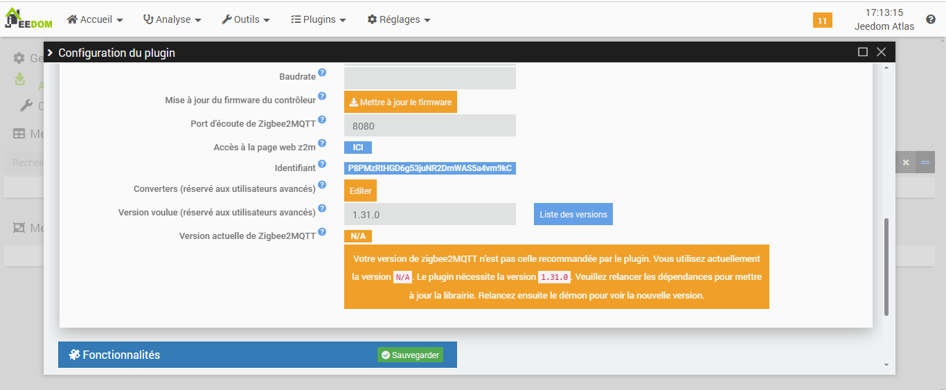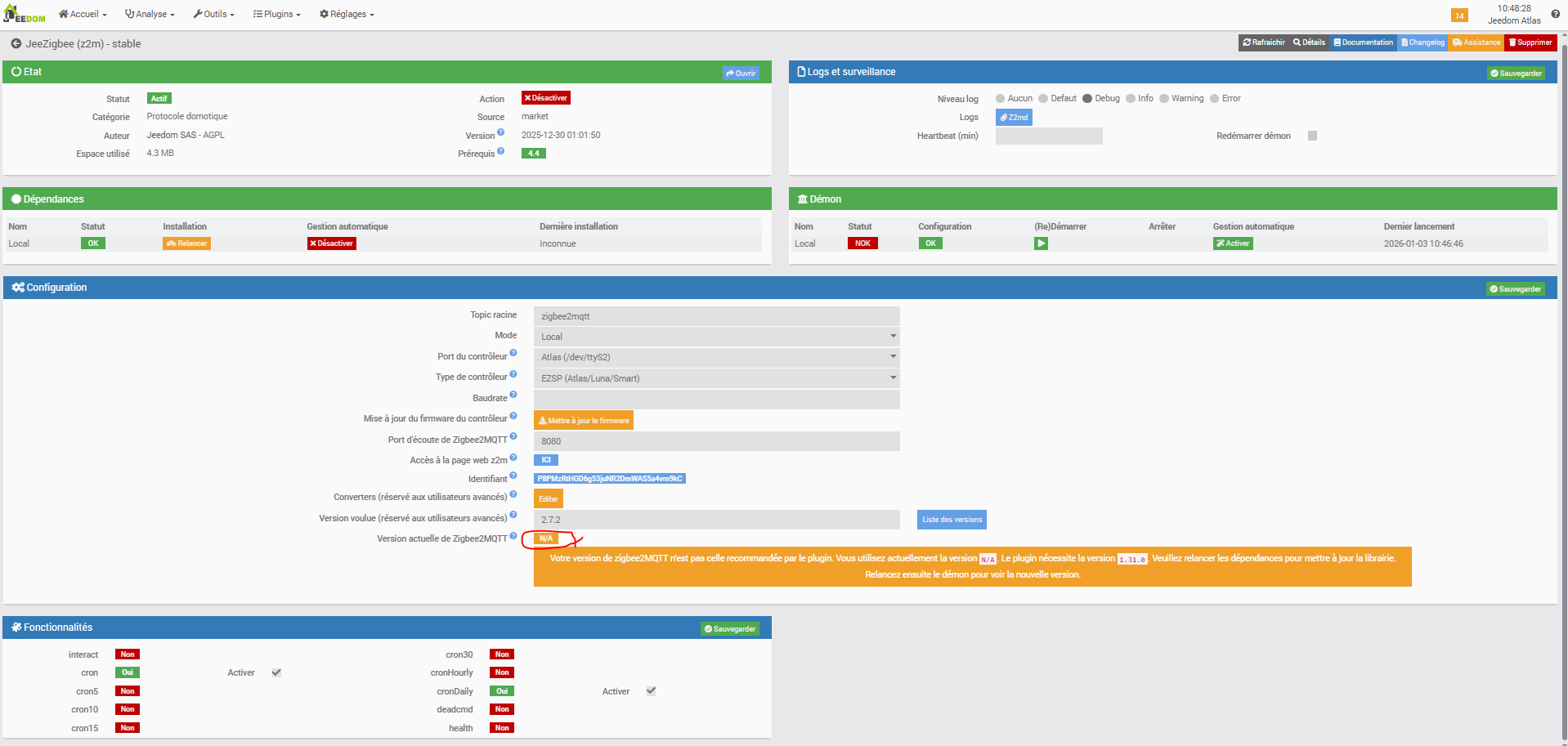 Je n’avais pas touché mon Jeedom Atlas depuis un long moment, suite de gros travaux dans la maison. Je me suis remis dessus aujourd’hui pour tout remettre à niveau et connecter de nouveaux appareils en zigbee.