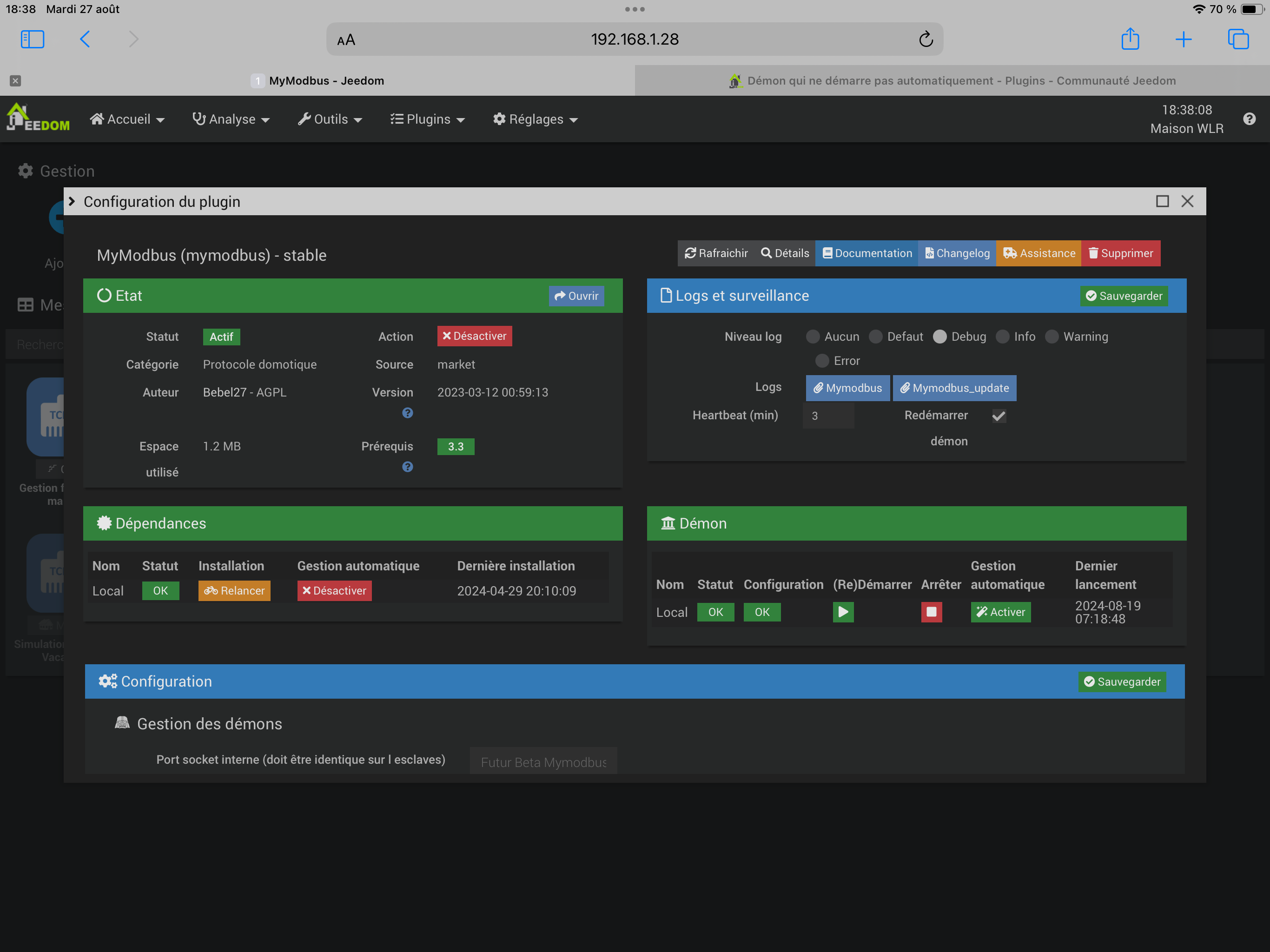 Et pourtant j’ai renseigné dans la configuration Heartbeat 3 min et j’ai coché Redémarrer demon.