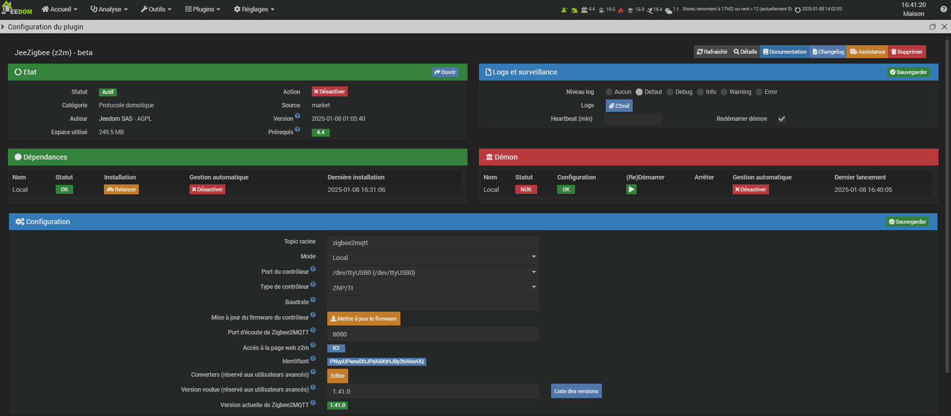 [2025-01-08 17:17:49] e[34mdebuge[39m: z2m: Using zigbee-herdsman with settings: '"{\"network\":{\"panID\":6754,\"extendedPanID\":[221,221,221,221,221,221,221,221],\"channelList\":[11],\"networkKey\":\"HIDDEN\"},\"databasePath\":\"/var/www/html/plugins/z2m/data/database.db\",\"databaseBackupPath\":\"/var/www/html/plugins/z2m/data/database.db.backup\",\"backupPath\":\"/var/www/html/plugins/z2m/data/coordinator_backup.json\",\"serialPort\":{\"path\":\"/dev/ttyUSB0\",\"adapter\":\"zstack\"},\"adapter\":{\"disableLED\":false}}"'