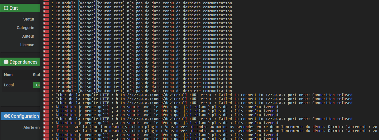 [2023-12-01 20:24:11]ERROR : Erreur sur la fonction deamon_start du plugin : Vous devez attendre au moins 45 secondes entre deux lancements du démon. Dernier lancement : 2023-12-01 20:23:57