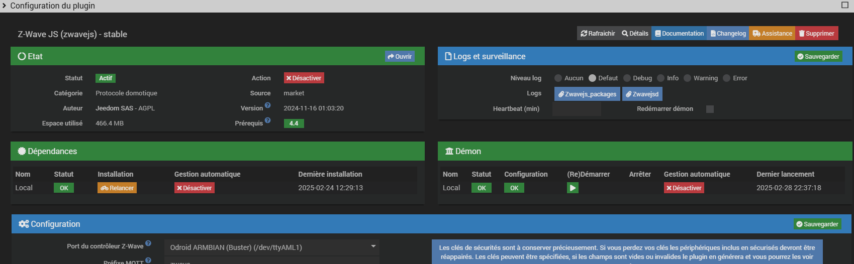 bonsoir, j’ai basculé ma Jeedom smart en Debian11 en changeant l’emmc achetée chez Domadoo. Du coup, j’ai dû remplacer openzwave par le plugin Zwave-js pour gerer mes modules Zwave. J’ai testé une coupure de courant, le demon Zwave-js n’a pas redémarré, apres 5 min, j’ai finis par redemarrer manuellement le demon. je n’ai jamais eu ce probleme avec l’ancien plugin. si quelqu’un peut m’aider a gerer ce probleme, je suis preneur . pour info tous les modules zwave sont devenus protocolinfo mais fonctionne quand meme.