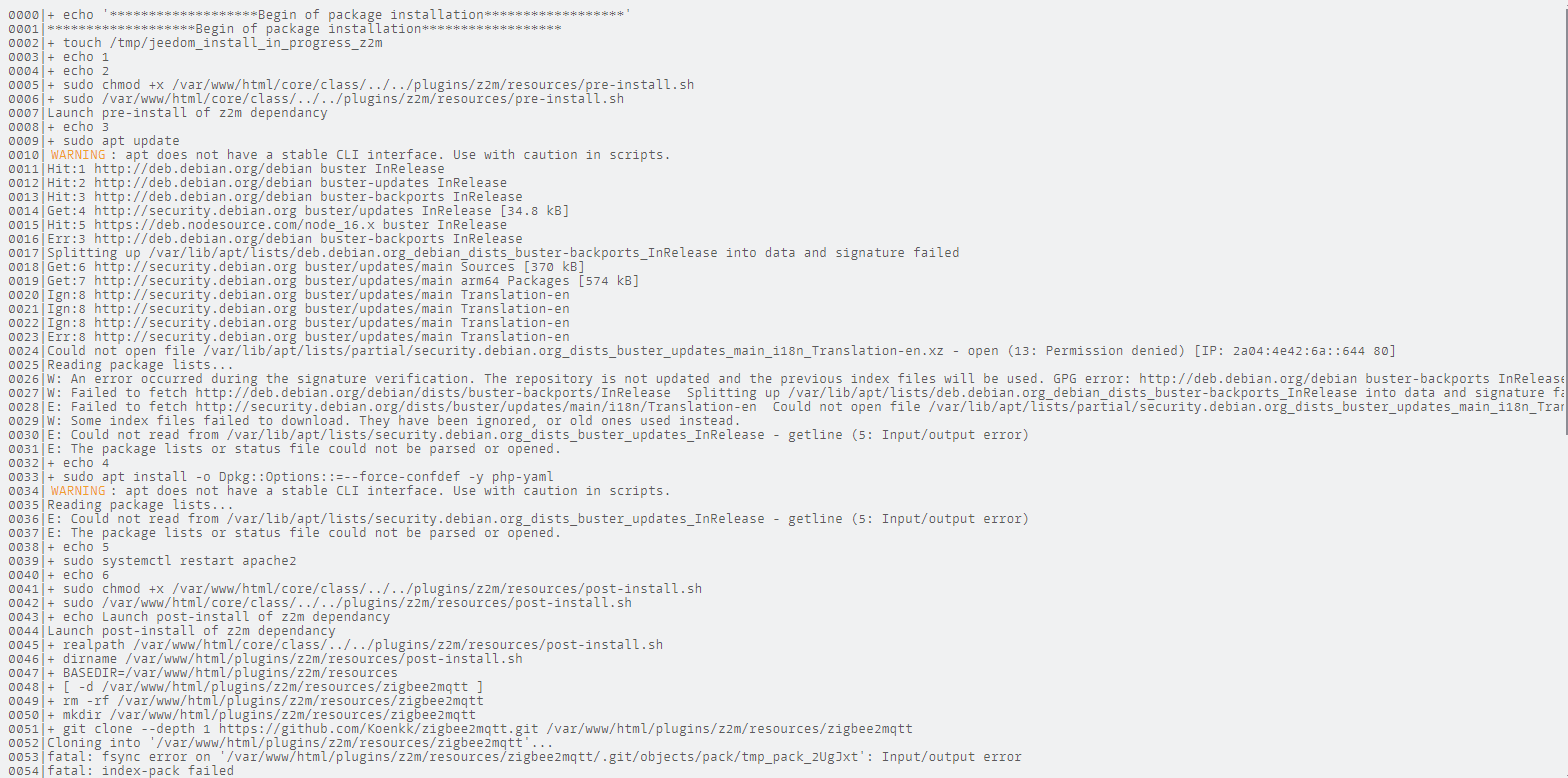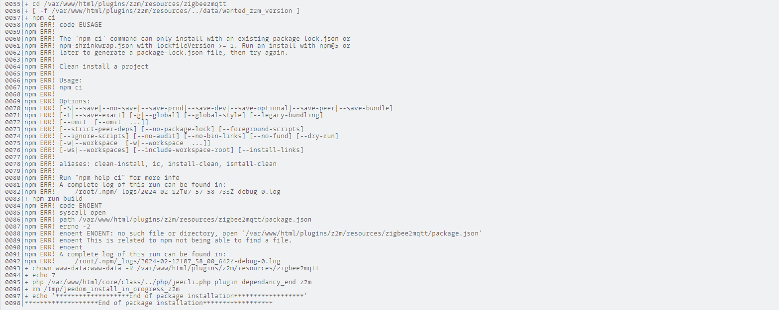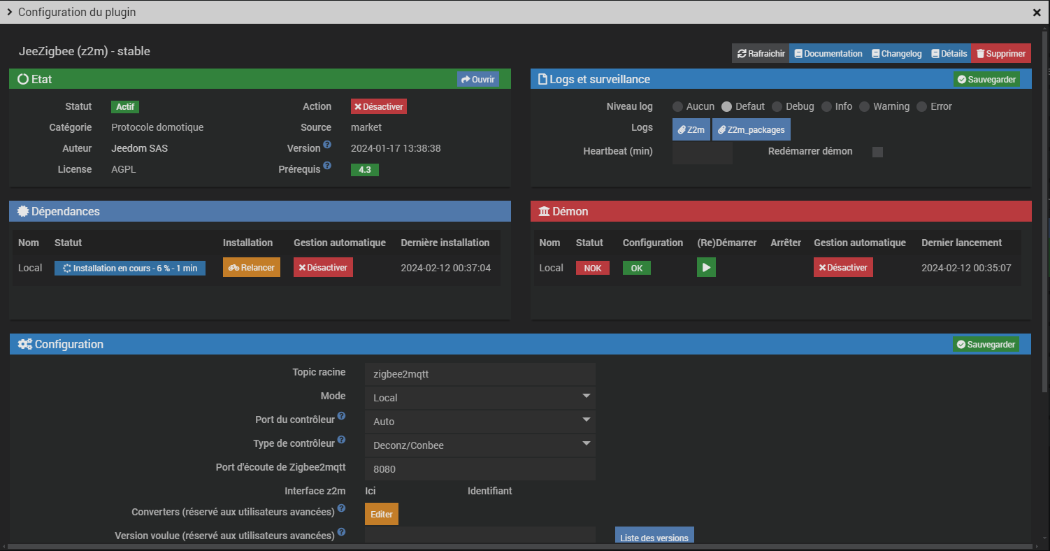 Suite à l’installation du plugin z2m, l’installation des dépendances se bloque à 6% et après quelques minutes, retour au statut NOK.