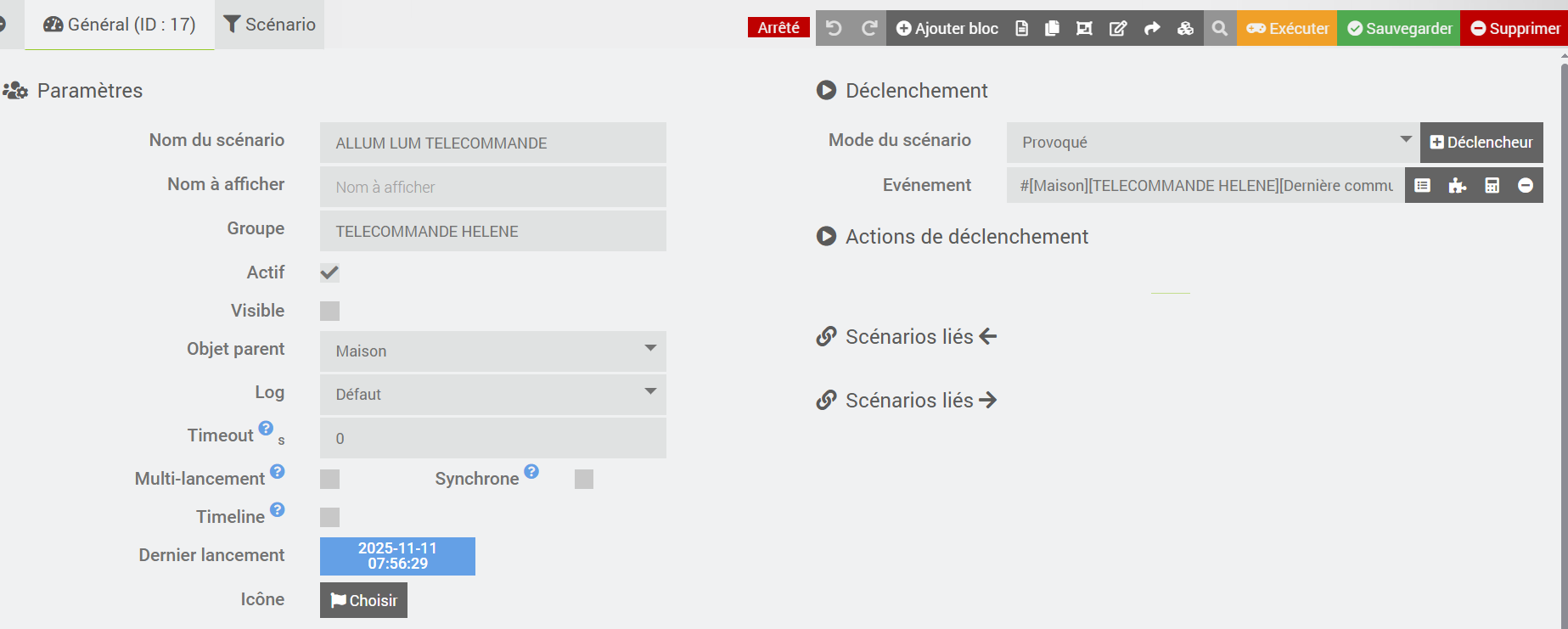 J’ai le déclenchement de mon programme tout le temps jusqu’à ce que le button arrive sur un autre état (‹ arm_day_zones › par exemple). Et comme je sais que quand on part de la maison, on ne choppe plus le réseau Zigbee avec cette télécommande, je voulais que la lumière s’arrête d’elle même au bout de 5 min si on n’appuyait pas sur le bouton éteindre