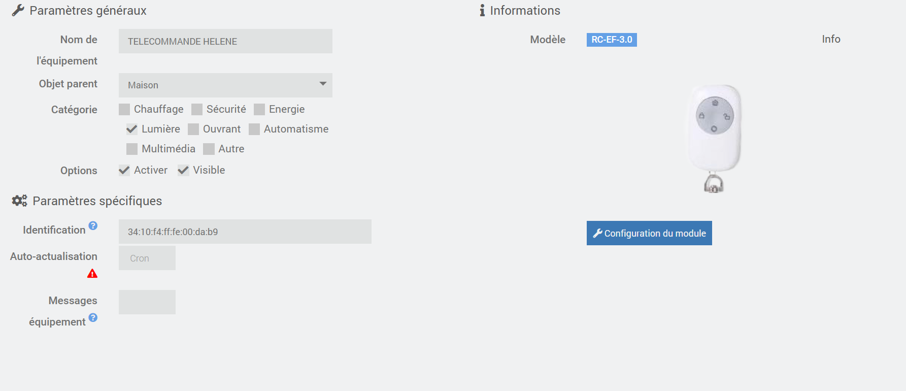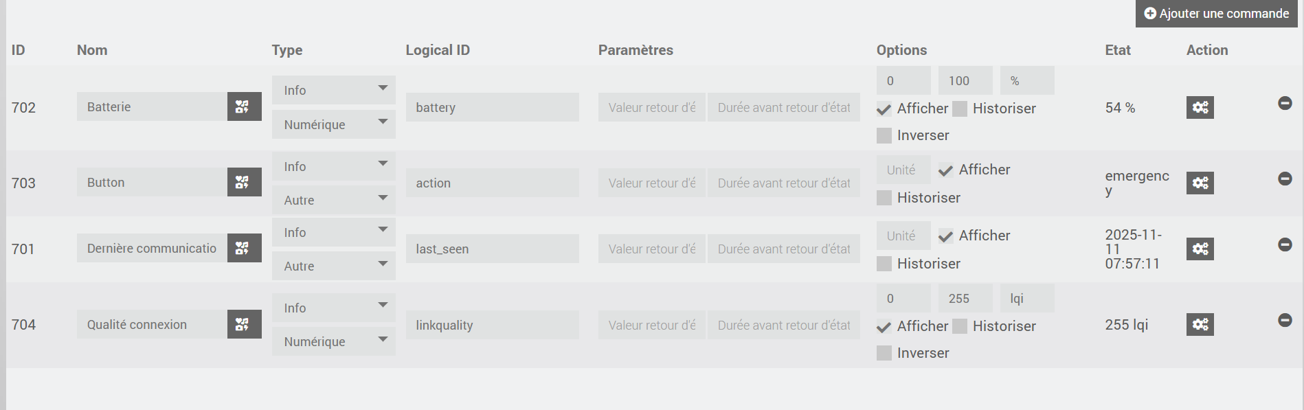 Cette télécommande remonte 4 infos et dans « Button » il y a 4 modes (à la base, il s’agit d’une télécommande pour activer ou désactiver une alarme que je voulais reconvertir en allumage de lumière (avec arrêt automatique) et arrêt de l’allumage
