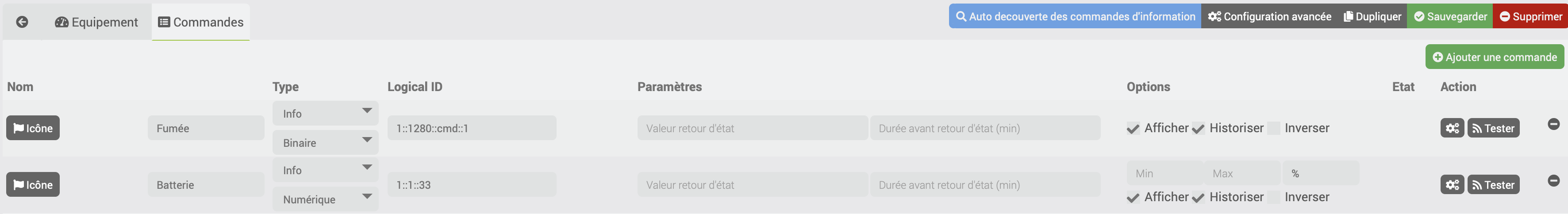 Pour vérifier que la commande est cohérente, tu veux aller voir dans l’onglet Analyse → Equipement qui remonte tous les niveaux de batterie que tu es mappé la commande ou non.