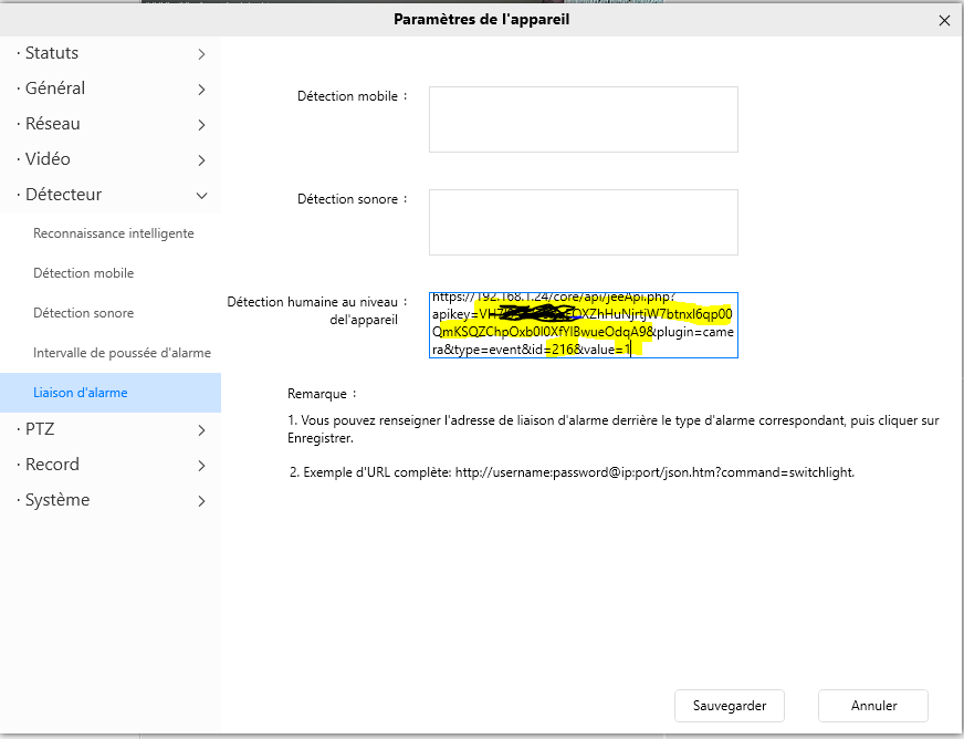 → si on désactive la détection via Jeedom attention le calendrier n’est pas ré activé sans l’envoi d’e commande spécifique et la détection ne fonction plus