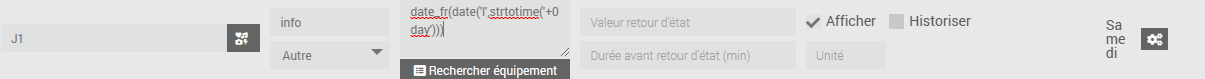 J’avais dans mon virtuel pour chaque numéro de jour entré la formule date_fr(date(‹ l ›,strtotime(‹ +0 day ›))) en remplaçant pour les 30 jours le 0 par 1 à 30. Cela a fonctionné mais depuis que j’ai redémarrer mon jeedom suite à la mise à jour du PROXMOX qui l’héberge, les jours ne correspondent plus comme on peut le voir sur l’imprim écran du virtuel car il doit commencer à partir du jour en cours pour le 1 (J1)