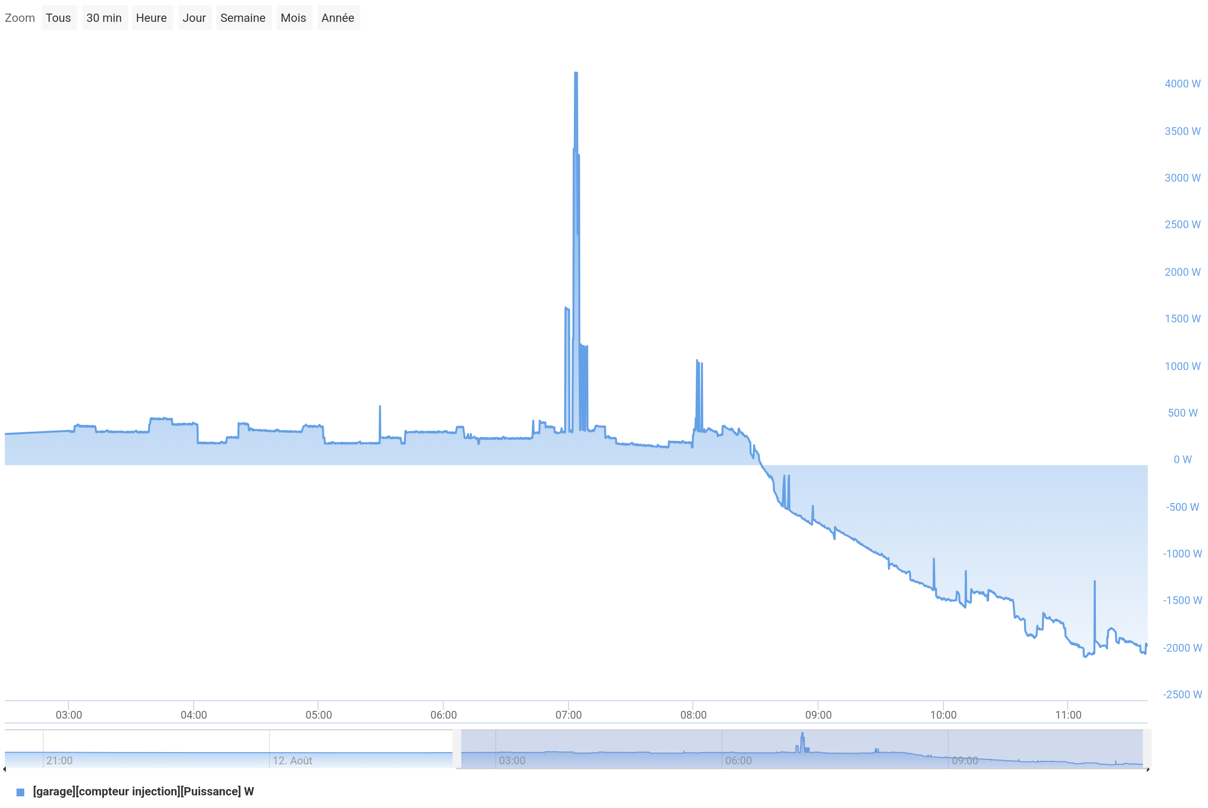 Dans le graphique, le courant avec une valeur positive c’est quand je consomme du courant d’EDF et quand cela devient négatif comme valeur, c’est quand j’injecte dans le réseau EDF mon surplus produit par mes panneaux.