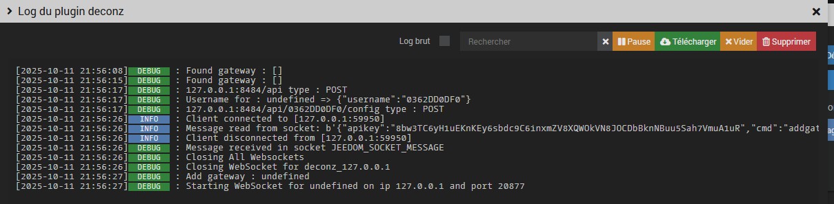 Je me dis donc que je peux reconnecter à Jeedom et réessayer. J’en profite pour désinstaller le plugin et de réinstaller l’ensemble en suivant la procédure indiquée dans la doc.