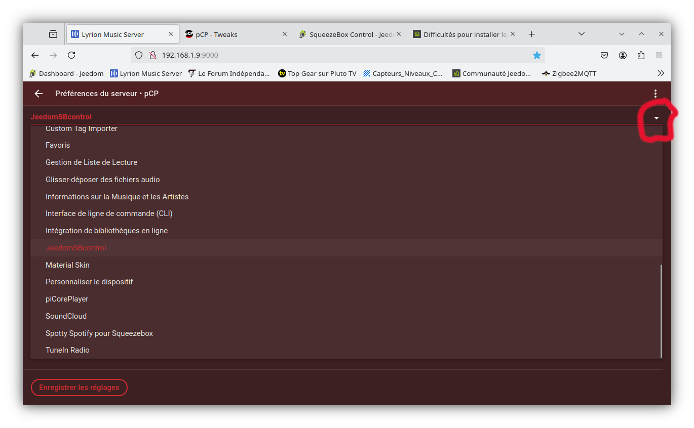 Puis dézippé dans un dossier JeedomSBcontrol dans /usr/share/squeezeboxcontrol/Plugins et enfin changé le propriétaire du dossier et de ce qu’il contient : sudo chown -R squeezeboxserver:nogroup JeedomSBcontrol